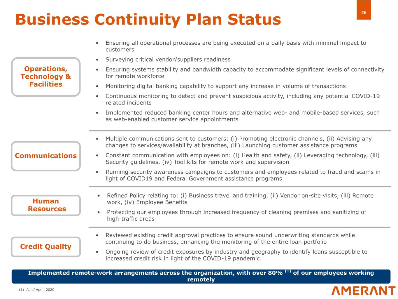 Business Continuity Plan Status 26 • Ensuring all operational processes are being executed on a daily basis with minimal impact to customers • Surveying critical vendor/suppliers readiness Operations, • Ensuring systems stability and bandwidth capacity to accommodate significant levels of connectivity Technology & for remote workforce Facilities • Monitoring digital banking capability to support any increase in volume of transactions • Continuous monitoring to detect and prevent suspicious activity, including any potential COVID-19 related incidents • Implemented reduced banking center hours and alternative web- and mobile-based services, such as web-enabled customer service appointments • Multiple communications sent to customers: (i) Promoting electronic channels, (ii) Advising any changes to services/availability at branches, (iii) Launching customer assistance programs Communications • Constant communication with employees on: (i) Health and safety, (ii) Leveraging technology, (iii) Security guidelines, (iv) Tool kits for remote work and supervision • Running security awareness campaigns to customers and employees related to fraud and scams in light of COVID19 and Federal Government assistance programs • Refined Policy relating to: (i) Business travel and training, (ii) Vendor on-site visits, (iii) Remote Human work, (iv) Employee Benefits Resources • Protecting our employees through increased frequency of cleaning premises and sanitizing of high-traffic areas • Reviewed existing credit approval practices to ensure sound underwriting standards while continuing to do business, enhancing the monitoring of the entire loan portfolio Credit Quality • Ongoing review of credit exposures by industry and geography to identify loans susceptible to increased credit risk in light of the COVID-19 pandemic Implemented remote-work arrangements across the organization, with over 80% (1) of our employees working remotely (1) As of April, 2020