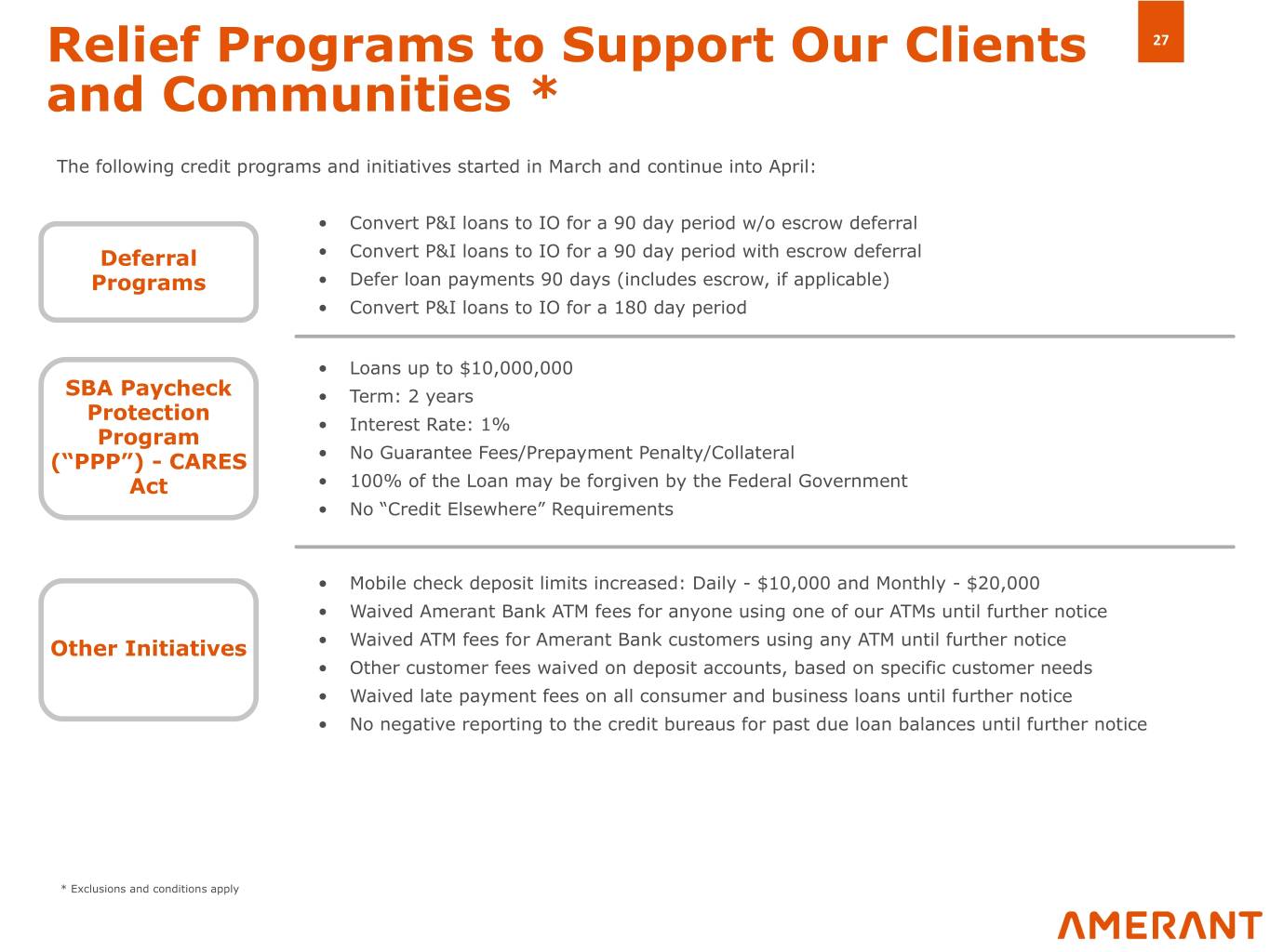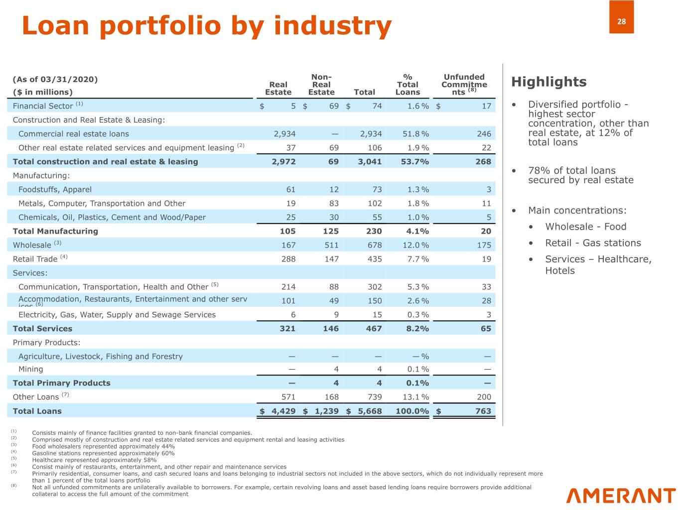 Relief Programs to Support Our Clients 27 and Communities * The following credit programs and initiatives started in March and continue into April: • Convert P&I loans to IO for a 90 day period w/o escrow deferral Deferral • Convert P&I loans to IO for a 90 day period with escrow deferral Programs • Defer loan payments 90 days (includes escrow, if applicable) • Convert P&I loans to IO for a 180 day period • Loans up to $10,000,000 SBA Paycheck • Term: 2 years Protection • Interest Rate: 1% Program (“PPP”) - CARES • No Guarantee Fees/Prepayment Penalty/Collateral Act • 100% of the Loan may be forgiven by the Federal Government • No “Credit Elsewhere” Requirements • Mobile check deposit limits increased: Daily - $10,000 and Monthly - $20,000 • Waived Amerant Bank ATM fees for anyone using one of our ATMs until further notice Other Initiatives • Waived ATM fees for Amerant Bank customers using any ATM until further notice • Other customer fees waived on deposit accounts, based on specific customer needs • Waived late payment fees on all consumer and business loans until further notice • No negative reporting to the credit bureaus for past due loan balances until further notice * Exclusions and conditions apply