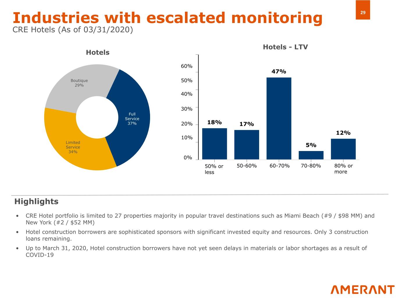 Loan portfolio by industry 28 (As of 03/31/2020) Non- % Unfunded Real Real Total Commitme Highlights ($ in millions) Estate Estate Total Loans nts (8) Financial Sector (1) $ 5 $ 69 $ 74 1.6 % $ 17 • Diversified portfolio - highest sector Construction and Real Estate & Leasing: concentration, other than Commercial real estate loans 2,934 — 2,934 51.8 % 246 real estate, at 12% of total loans Other real estate related services and equipment leasing (2) 37 69 106 1.9 % 22 Total construction and real estate & leasing 2,972 69 3,041 53.7% 268 • 78% of total loans Manufacturing: secured by real estate Foodstuffs, Apparel 61 12 73 1.3 % 3 Metals, Computer, Transportation and Other 19 83 102 1.8 % 11 • Main concentrations: Chemicals, Oil, Plastics, Cement and Wood/Paper 25 30 55 1.0 % 5 Total Manufacturing 105 125 230 4.1% 20 • Wholesale - Food Wholesale (3) 167 511 678 12.0 % 175 • Retail - Gas stations Retail Trade (4) 288 147 435 7.7 % 19 • Services – Healthcare, Services: Hotels Communication, Transportation, Health and Other (5) 214 88 302 5.3 % 33 Accommodation, Restaurants, Entertainment and other serv 101 49 150 2.6 % 28 ices (6) Electricity, Gas, Water, Supply and Sewage Services 6 9 15 0.3 % 3 Total Services 321 146 467 8.2% 65 Primary Products: Agriculture, Livestock, Fishing and Forestry — — — — % — Mining — 4 4 0.1 % — Total Primary Products — 4 4 0.1% — Other Loans (7) 571 168 739 13.1 % 200 Total Loans $ 4,429 $ 1,239 $ 5,668 100.0% $ 763 (1) Consists mainly of finance facilities granted to non-bank financial companies. (2) Comprised mostly of construction and real estate related services and equipment rental and leasing activities (3) Food wholesalers represented approximately 44% (4) Gasoline stations represented approximately 60% (5) Healthcare represented approximately 58% (6) Consist mainly of restaurants, entertainment, and other repair and maintenance services (7) Primarily residential, consumer loans, and cash secured loans and loans belonging to industrial sectors not included in the above sectors, which do not individually represent more than 1 percent of the total loans portfolio (8) Not all unfunded commitments are unilaterally available to borrowers. For example, certain revolving loans and asset based lending loans require borrowers provide additional collateral to access the full amount of the commitment