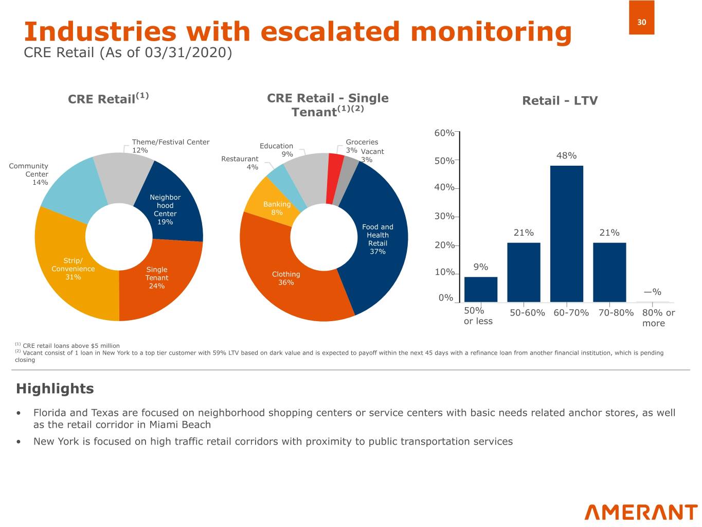 Industries with escalated monitoring 29 CRE Hotels (As of 03/31/2020) Hotels - LTV Hotels 60% 47% Boutique 50% 29% 40% 30% Full Service 37% 20% 18% 17% 12% 10% Limited Service 5% 34% 0% 50% or 50-60% 60-70% 70-80% 80% or less more Highlights • CRE Hotel portfolio is limited to 27 properties majority in popular travel destinations such as Miami Beach (#9 / $98 MM) and New York (#2 / $52 MM) • Hotel construction borrowers are sophisticated sponsors with significant invested equity and resources. Only 3 construction loans remaining. • Up to March 31, 2020, Hotel construction borrowers have not yet seen delays in materials or labor shortages as a result of COVID-19