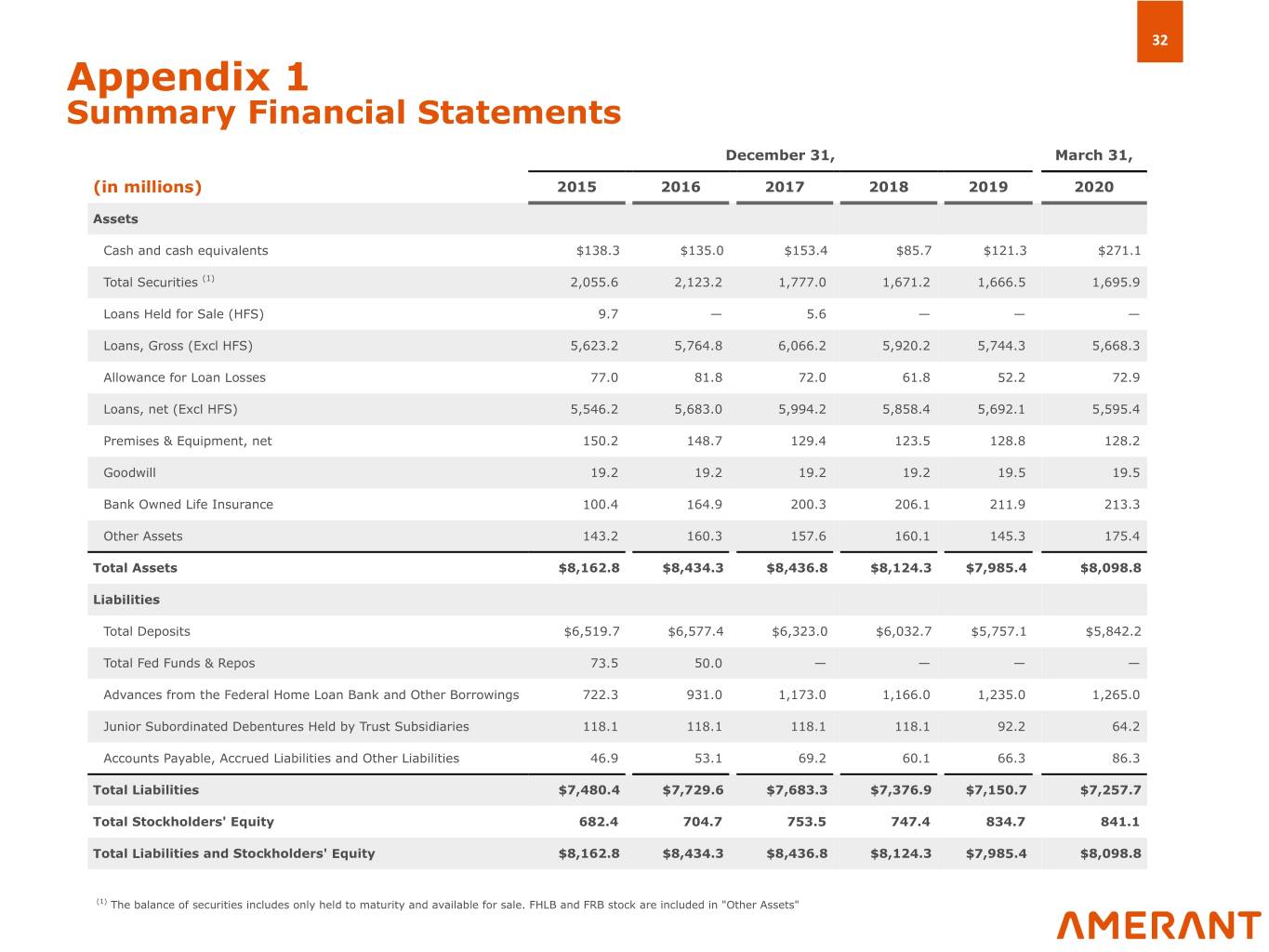 32 Appendix 1 Summary Financial Statements December 31, March 31, (in millions) 2015 2016 2017 2018 2019 2020 Assets Cash and cash equivalents $138.3 $135.0 $153.4 $85.7 $121.3 $271.1 Total Securities (1) 2,055.6 2,123.2 1,777.0 1,671.2 1,666.5 1,695.9 Loans Held for Sale (HFS) 9.7 — 5.6 — — — Loans, Gross (Excl HFS) 5,623.2 5,764.8 6,066.2 5,920.2 5,744.3 5,668.3 Allowance for Loan Losses 77.0 81.8 72.0 61.8 52.2 72.9 Loans, net (Excl HFS) 5,546.2 5,683.0 5,994.2 5,858.4 5,692.1 5,595.4 Premises & Equipment, net 150.2 148.7 129.4 123.5 128.8 128.2 Goodwill 19.2 19.2 19.2 19.2 19.5 19.5 Bank Owned Life Insurance 100.4 164.9 200.3 206.1 211.9 213.3 Other Assets 143.2 160.3 157.6 160.1 145.3 175.4 Total Assets $8,162.8 $8,434.3 $8,436.8 $8,124.3 $7,985.4 $8,098.8 Liabilities Total Deposits $6,519.7 $6,577.4 $6,323.0 $6,032.7 $5,757.1 $5,842.2 Total Fed Funds & Repos 73.5 50.0 — — — — Advances from the Federal Home Loan Bank and Other Borrowings 722.3 931.0 1,173.0 1,166.0 1,235.0 1,265.0 Junior Subordinated Debentures Held by Trust Subsidiaries 118.1 118.1 118.1 118.1 92.2 64.2 Accounts Payable, Accrued Liabilities and Other Liabilities 46.9 53.1 69.2 60.1 66.3 86.3 Total Liabilities $7,480.4 $7,729.6 $7,683.3 $7,376.9 $7,150.7 $7,257.7 Total Stockholders' Equity 682.4 704.7 753.5 747.4 834.7 841.1 Total Liabilities and Stockholders' Equity $8,162.8 $8,434.3 $8,436.8 $8,124.3 $7,985.4 $8,098.8 (1) The balance of securities includes only held to maturity and available for sale. FHLB and FRB stock are included in "Other Assets"