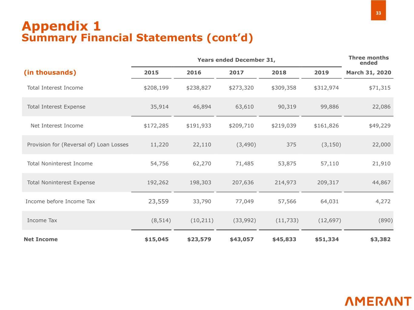 33 Appendix 1 Summary Financial Statements (cont’d) Years ended December 31, Three months ended (in thousands) 2015 2016 2017 2018 2019 March 31, 2020 Total Interest Income $208,199 $238,827 $273,320 $309,358 $312,974 $71,315 Total Interest Expense 35,914 46,894 63,610 90,319 99,886 22,086 Net Interest Income $172,285 $191,933 $209,710 $219,039 $161,826 $49,229 Provision for (Reversal of) Loan Losses 11,220 22,110 (3,490) 375 (3,150) 22,000 Total Noninterest Income 54,756 62,270 71,485 53,875 57,110 21,910 Total Noninterest Expense 192,262 198,303 207,636 214,973 209,317 44,867 Income before Income Tax 23,559 33,790 77,049 57,566 64,031 4,272 Income Tax (8,514) (10,211) (33,992) (11,733) (12,697) (890) Net Income $15,045 $23,579 $43,057 $45,833 $51,334 $3,382