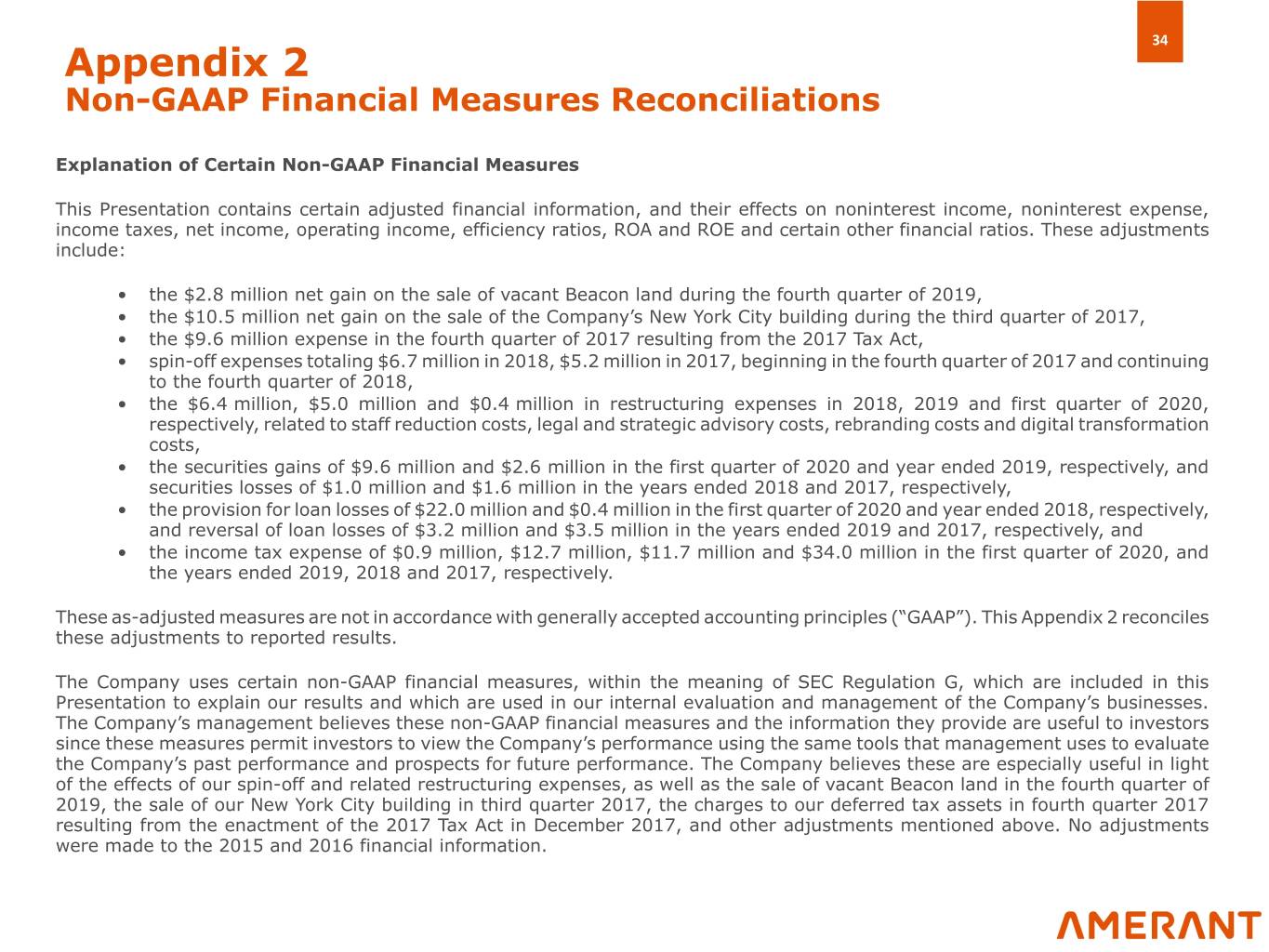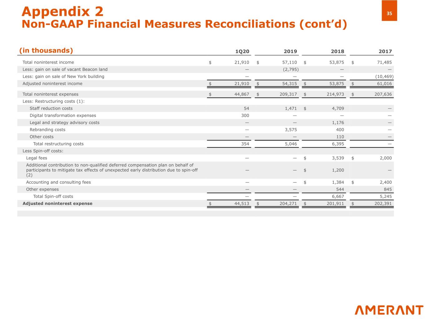 34 Appendix 2 Non-GAAP Financial Measures Reconciliations Explanation of Certain Non-GAAP Financial Measures This Presentation contains certain adjusted financial information, and their effects on noninterest income, noninterest expense, income taxes, net income, operating income, efficiency ratios, ROA and ROE and certain other financial ratios. These adjustments include: • the $2.8 million net gain on the sale of vacant Beacon land during the fourth quarter of 2019, • the $10.5 million net gain on the sale of the Company’s New York City building during the third quarter of 2017, • the $9.6 million expense in the fourth quarter of 2017 resulting from the 2017 Tax Act, • spin-off expenses totaling $6.7 million in 2018, $5.2 million in 2017, beginning in the fourth quarter of 2017 and continuing to the fourth quarter of 2018, • the $6.4 million, $5.0 million and $0.4 million in restructuring expenses in 2018, 2019 and first quarter of 2020, respectively, related to staff reduction costs, legal and strategic advisory costs, rebranding costs and digital transformation costs, • the securities gains of $9.6 million and $2.6 million in the first quarter of 2020 and year ended 2019, respectively, and securities losses of $1.0 million and $1.6 million in the years ended 2018 and 2017, respectively, • the provision for loan losses of $22.0 million and $0.4 million in the first quarter of 2020 and year ended 2018, respectively, and reversal of loan losses of $3.2 million and $3.5 million in the years ended 2019 and 2017, respectively, and • the income tax expense of $0.9 million, $12.7 million, $11.7 million and $34.0 million in the first quarter of 2020, and the years ended 2019, 2018 and 2017, respectively. These as-adjusted measures are not in accordance with generally accepted accounting principles (“GAAP”). This Appendix 2 reconciles these adjustments to reported results. The Company uses certain non-GAAP financial measures, within the meaning of SEC Regulation G, which are included in this Presentation to explain our results and which are used in our internal evaluation and management of the Company’s businesses. The Company’s management believes these non-GAAP financial measures and the information they provide are useful to investors since these measures permit investors to view the Company’s performance using the same tools that management uses to evaluate the Company’s past performance and prospects for future performance. The Company believes these are especially useful in light of the effects of our spin-off and related restructuring expenses, as well as the sale of vacant Beacon land in the fourth quarter of 2019, the sale of our New York City building in third quarter 2017, the charges to our deferred tax assets in fourth quarter 2017 resulting from the enactment of the 2017 Tax Act in December 2017, and other adjustments mentioned above. No adjustments were made to the 2015 and 2016 financial information.