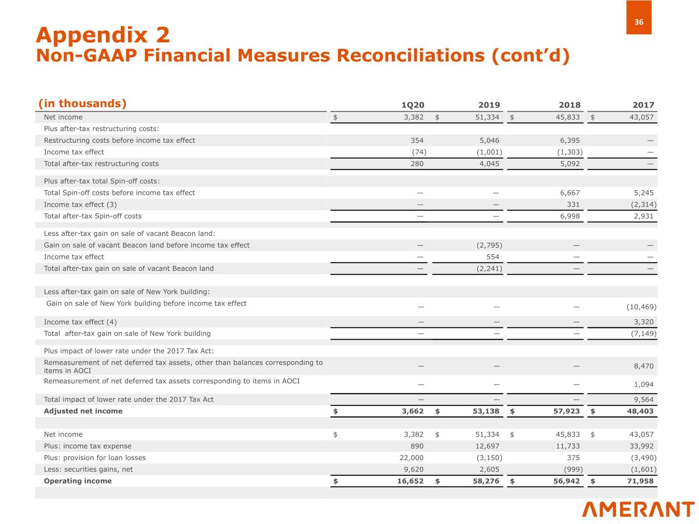 Appendix 2 35 Non-GAAP Financial Measures Reconciliations (cont’d) (in thousands) 1Q20 2019 2018 2017 Total noninterest income $ 21,910 $ 57,110 $ 53,875 $ 71,485 Less: gain on sale of vacant Beacon land — (2,795) — — Less: gain on sale of New York building — — — (10,469) Adjusted noninterest income $ 21,910 $ 54,315 $ 53,875 $ 61,016 Total noninterest expenses $ 44,867 $ 209,317 $ 214,973 $ 207,636 Less: Restructuring costs (1): Staff reduction costs 54 1,471 $ 4,709 — Digital transformation expenses 300 — — — Legal and strategy advisory costs — — 1,176 — Rebranding costs — 3,575 400 — Other costs — — 110 — Total restructuring costs 354 5,046 6,395 — Less Spin-off costs: Legal fees — — $ 3,539 $ 2,000 Additional contribution to non-qualified deferred compensation plan on behalf of participants to mitigate tax effects of unexpected early distribution due to spin-off — — $ 1,200 — (2) Accounting and consulting fees — — $ 1,384 $ 2,400 Other expenses — — 544 845 Total Spin-off costs — — 6,667 5,245 Adjusted noninterest expense $ 44,513 $ 204,271 $ 201,911 $ 202,391