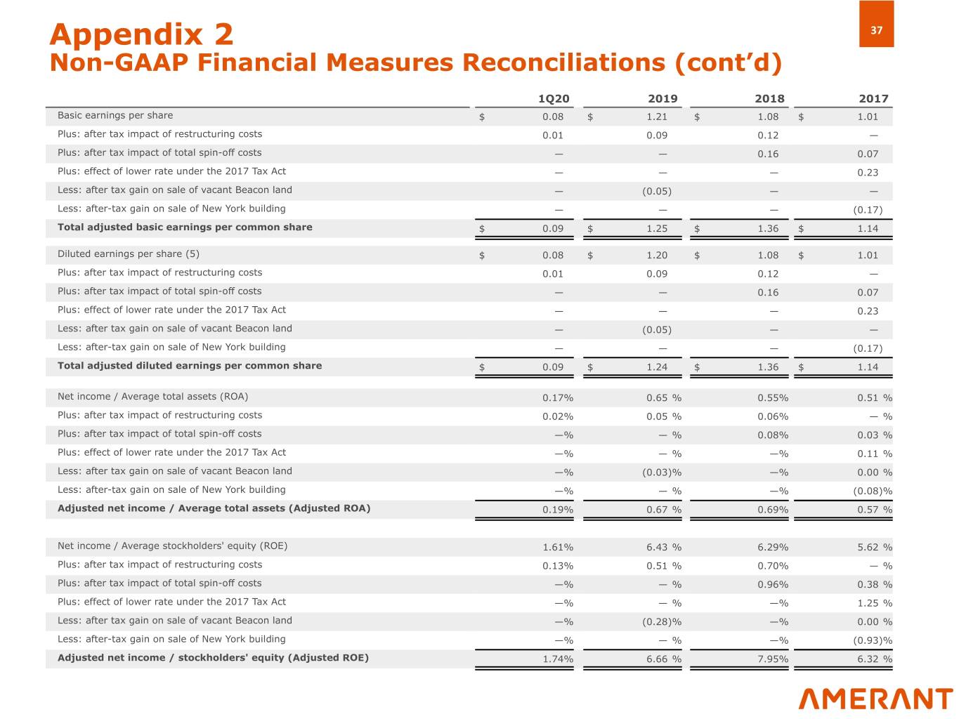 Appendix 2 37 Non-GAAP Financial Measures Reconciliations (cont’d) 1Q20 2019 2018 2017 Basic earnings per share $ 0.08 $ 1.21 $ 1.08 $ 1.01 Plus: after tax impact of restructuring costs 0.01 0.09 0.12 — Plus: after tax impact of total spin-off costs — — 0.16 0.07 Plus: effect of lower rate under the 2017 Tax Act — — — 0.23 Less: after tax gain on sale of vacant Beacon land — (0.05) — — Less: after-tax gain on sale of New York building — — — (0.17) Total adjusted basic earnings per common share $ 0.09 $ 1.25 $ 1.36 $ 1.14 Diluted earnings per share (5) $ 0.08 $ 1.20 $ 1.08 $ 1.01 Plus: after tax impact of restructuring costs 0.01 0.09 0.12 — Plus: after tax impact of total spin-off costs — — 0.16 0.07 Plus: effect of lower rate under the 2017 Tax Act — — — 0.23 Less: after tax gain on sale of vacant Beacon land — (0.05) — — Less: after-tax gain on sale of New York building — — — (0.17) Total adjusted diluted earnings per common share $ 0.09 $ 1.24 $ 1.36 $ 1.14 Net income / Average total assets (ROA) 0.17% 0.65 % 0.55% 0.51 % Plus: after tax impact of restructuring costs 0.02% 0.05 % 0.06% — % Plus: after tax impact of total spin-off costs —% — % 0.08% 0.03 % Plus: effect of lower rate under the 2017 Tax Act —% — % —% 0.11 % Less: after tax gain on sale of vacant Beacon land —% (0.03)% —% 0.00 % Less: after-tax gain on sale of New York building —% — % —% (0.08)% Adjusted net income / Average total assets (Adjusted ROA) 0.19% 0.67 % 0.69% 0.57 % Net income / Average stockholders' equity (ROE) 1.61% 6.43 % 6.29% 5.62 % Plus: after tax impact of restructuring costs 0.13% 0.51 % 0.70% — % Plus: after tax impact of total spin-off costs —% — % 0.96% 0.38 % Plus: effect of lower rate under the 2017 Tax Act —% — % —% 1.25 % Less: after tax gain on sale of vacant Beacon land —% (0.28)% —% 0.00 % Less: after-tax gain on sale of New York building —% — % —% (0.93)% Adjusted net income / stockholders' equity (Adjusted ROE) 1.74% 6.66 % 7.95% 6.32 %