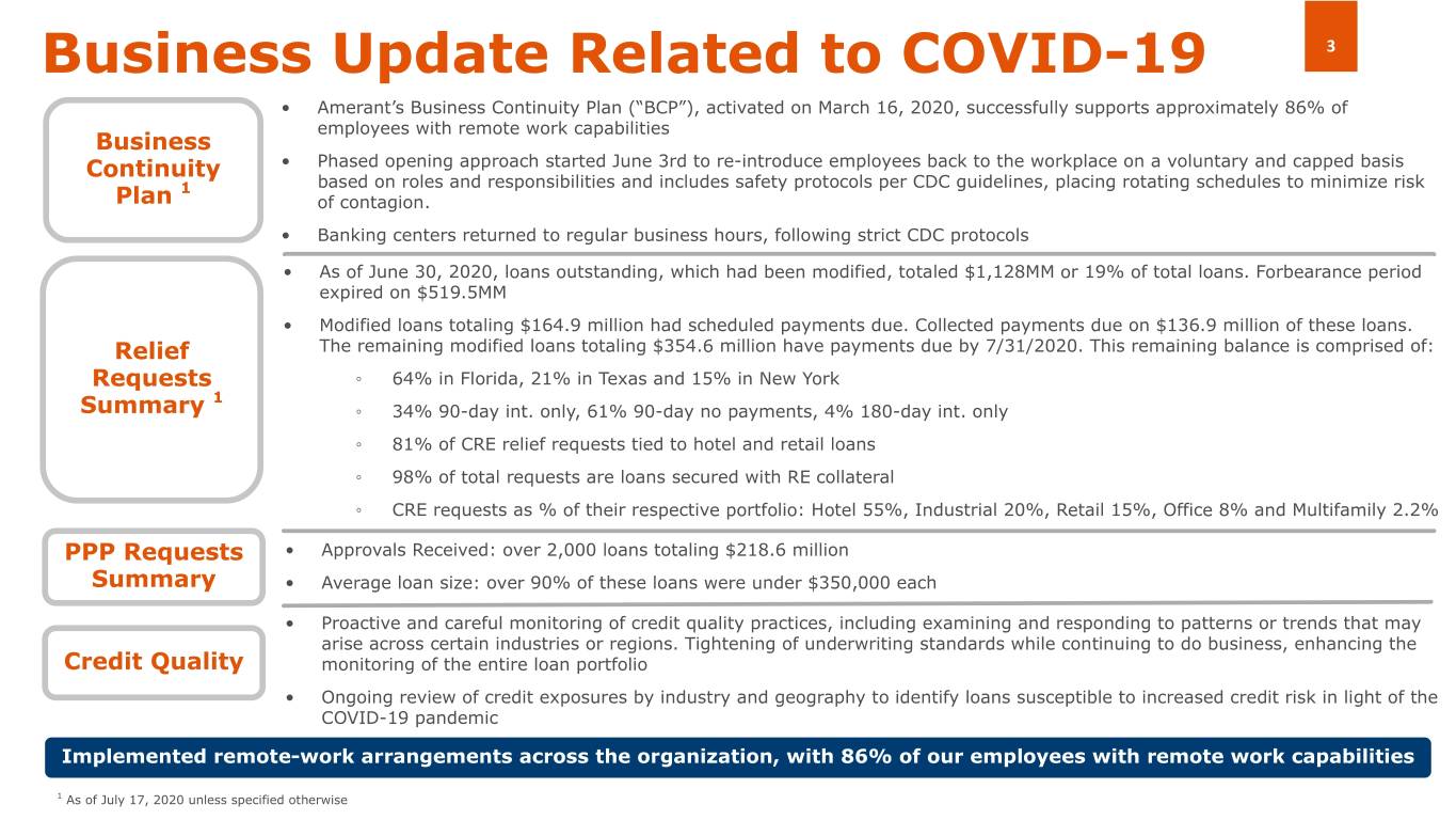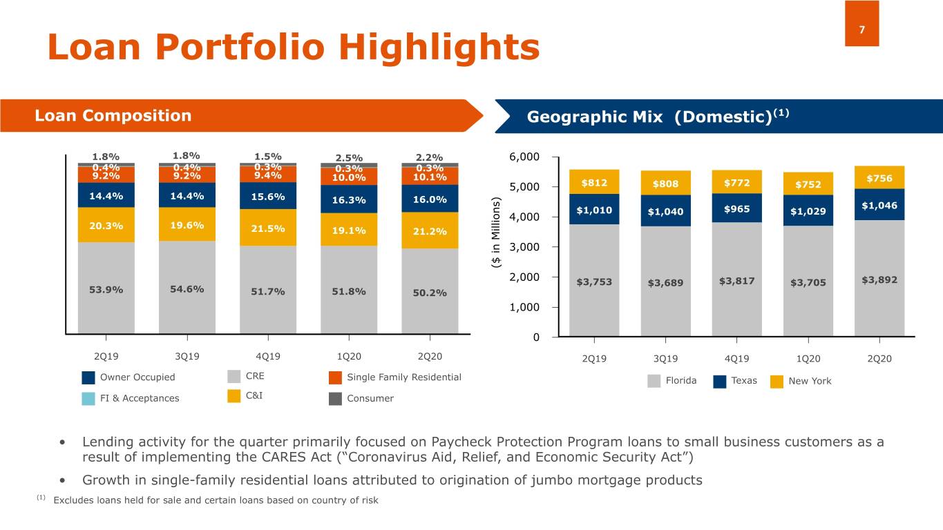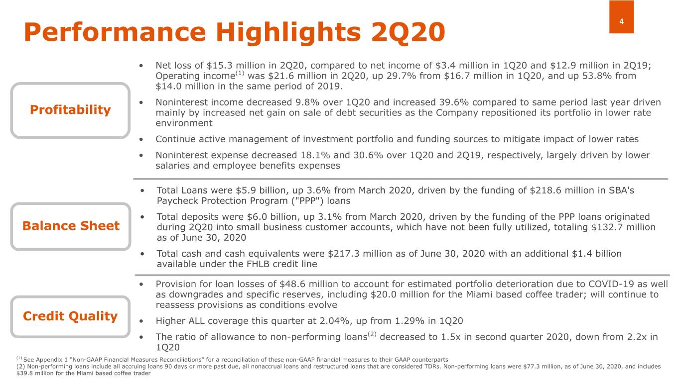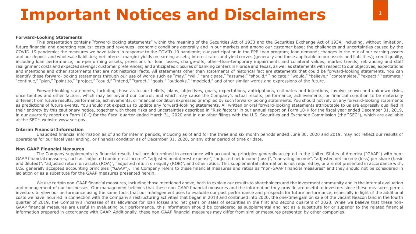 Important Notices and Disclaimers 2 Forward-Looking Statements This presentation contains “forward-looking statements” within the meaning of the Securities Act of 1933 and the Securities Exchange Act of 1934, including, without limitation, future financial and operating results; costs and revenues; economic conditions generally and in our markets and among our customer base; the challenges and uncertainties caused by the COVID-19 pandemic; the measures we have taken in response to the COVID-19 pandemic; our participation in the PPP Loan program; loan demand; changes in the mix of our earning assets and our deposit and wholesale liabilities; net interest margin; yields on earning assets; interest rates and yield curves (generally and those applicable to our assets and liabilities); credit quality, including loan performance, non-performing assets, provisions for loan losses, charge-offs, other-than-temporary impairments and collateral values; market trends; rebranding and staff realignment costs and expected savings; customer preferences; and anticipated closures of banking centers in Florida and Texas, as well as statements with respect to our objectives, expectations and intentions and other statements that are not historical facts. All statements other than statements of historical fact are statements that could be forward-looking statements. You can identify these forward-looking statements through our use of words such as “may,” “will,” “anticipate,” “assume,” “should,” “indicate,” “would,” “believe,” “contemplate,” “expect,” “estimate,” “continue,” “plan,” “point to,” “project,” “could,” “intend,” “target,” “goals,” “outlooks,” “modeled,” and other similar words and expressions of the future. Forward-looking statements, including those as to our beliefs, plans, objectives, goals, expectations, anticipations, estimates and intentions, involve known and unknown risks, uncertainties and other factors, which may be beyond our control, and which may cause the Company’s actual results, performance, achievements, or financial condition to be materially different from future results, performance, achievements, or financial condition expressed or implied by such forward-looking statements. You should not rely on any forward-looking statements as predictions of future events. You should not expect us to update any forward-looking statements. All written or oral forward-looking statements attributable to us are expressly qualified in their entirety by this cautionary notice, together with those risks and uncertainties described in “Risk factors” in our annual report on Form 10-K for the fiscal year ended December 31, 2019, in our quarterly report on Form 10-Q for the fiscal quarter ended March 31, 2020 and in our other filings with the U.S. Securities and Exchange Commission (the “SEC”), which are available at the SEC’s website www.sec.gov. Interim Financial Information Unaudited financial information as of and for interim periods, including as of and for the three and six month periods ended June 30, 2020 and 2019, may not reflect our results of operations for our fiscal year ending, or financial condition as of December 31, 2020, or any other period of time or date. Non-GAAP Financial Measures The Company supplements its financial results that are determined in accordance with accounting principles generally accepted in the United States of America (“GAAP”) with non- GAAP financial measures, such as “adjusted noninterest income”, “adjusted noninterest expense”, “adjusted net income (loss)”, “operating income”, “adjusted net income (loss) per share (basic and diluted)”, “adjusted return on assets (ROA)”, “adjusted return on equity (ROE)”, and other ratios. This supplemental information is not required by, or are not presented in accordance with, U.S. generally accepted accounting principles (“GAAP”). The Company refers to these financial measures and ratios as “non-GAAP financial measures” and they should not be considered in isolation or as a substitute for the GAAP measures presented herein. We use certain non-GAAP financial measures, including those mentioned above, both to explain our results to shareholders and the investment community and in the internal evaluation and management of our businesses. Our management believes that these non-GAAP financial measures and the information they provide are useful to investors since these measures permit investors to view our performance using the same tools that our management uses to evaluate our past performance and prospects for future performance, especially in light of the additional costs we have incurred in connection with the Company’s restructuring activities that began in 2018 and continued into 2020, the one-time gain on sale of the vacant Beacon land in the fourth quarter of 2019, the Company’s increases of its allowance for loan losses and net gains on sales of securities in the first and second quarters of 2020. While we believe that these non- GAAP financial measures are useful in evaluating our performance, this information should be considered as supplemental and not as a substitute for or superior to the related financial information prepared in accordance with GAAP. Additionally, these non-GAAP financial measures may differ from similar measures presented by other companies.