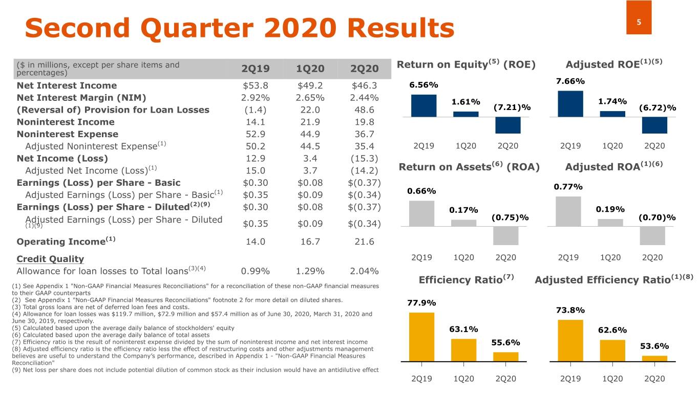 Appendix 1 27 Non-GAAP Financial Measures Reconciliations (cont’d) Three Months Ended, Six Months Ended June 30, ($ in thousands, except per share amounts) June 30, 2020 March 31, 2020 June 30, 2019 2020 2019 Net (loss) income $ (15,279) $ 3,382 $ 12,857 $ (11,897) $ 25,928 Plus after-tax restructuring costs: Restructuring costs before income tax effect 1,318 354 2,736 1,672 3,669 Income tax effect (273) (74) (588) (347) (789) Total after-tax restructuring costs 1,045 280 2,148 1,325 2,880 Adjusted net (loss) income $ (14,234) $ 3,662 $ 15,005 $ (10,572) $ 28,808 Net (loss) income $ (15,279) $ 3,382 $ 12,857 $ (11,897) $ 25,928 Plus: provision for income tax (benefit) expense (4,005) 890 3,524 (3,115) 7,101 Plus: provision for (reversal of) loan losses 48,620 22,000 (1,350) 70,620 (1,350) Less: securities gains, net 7,737 9,620 992 17,357 996 Operating income $ 21,599 $ 16,652 $ 14,039 $ 38,251 $ 30,683 Basic (loss) earnings per share $ (0.37) $ 0.08 $ 0.30 $ (0.28) $ 0.61 Plus: after tax impact of restructuring costs 0.03 0.01 0.05 0.03 0.07 Total adjusted basic (loss) earnings per common share $ (0.34) $ 0.09 $ 0.35 $ (0.25) $ 0.68