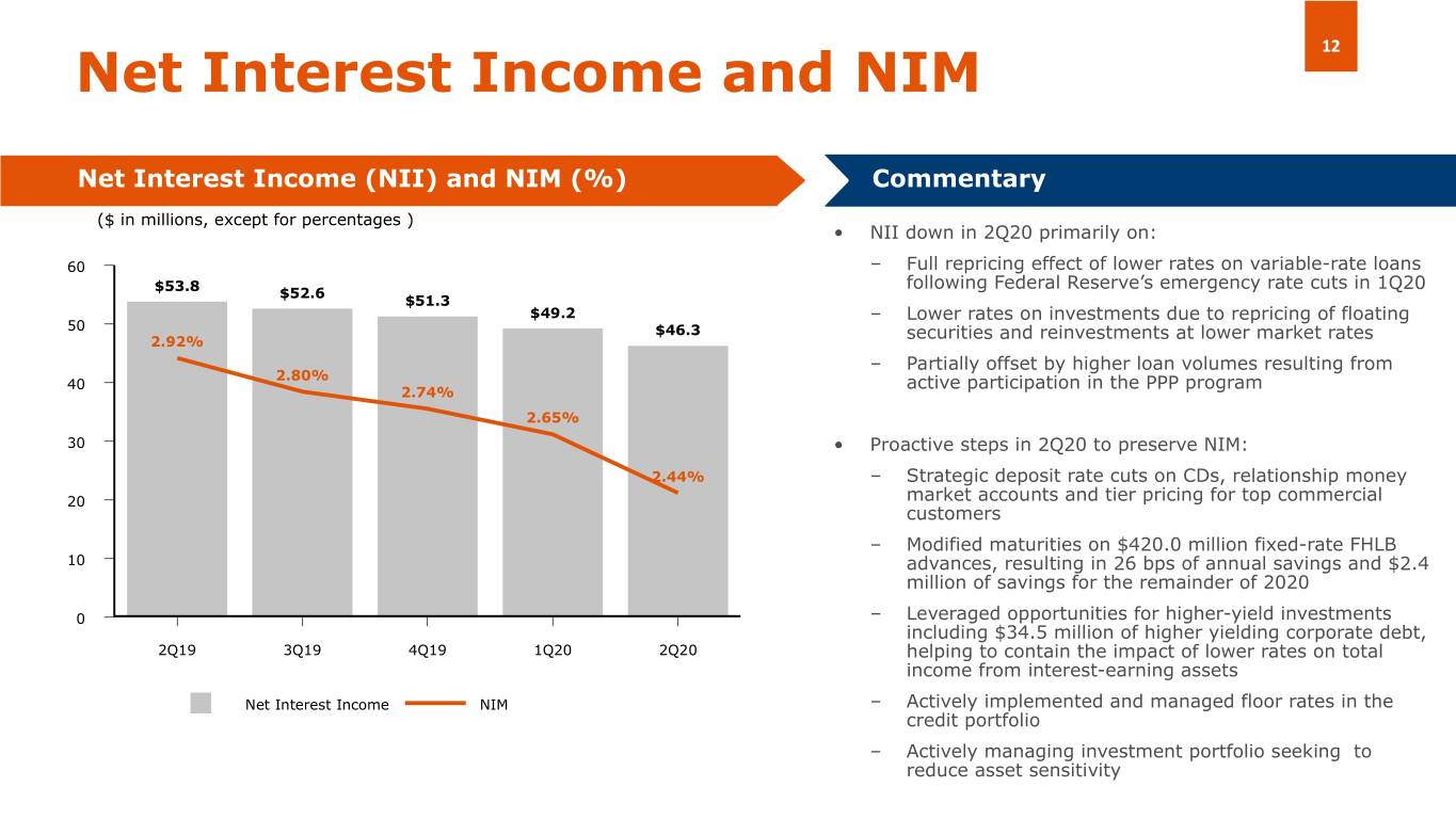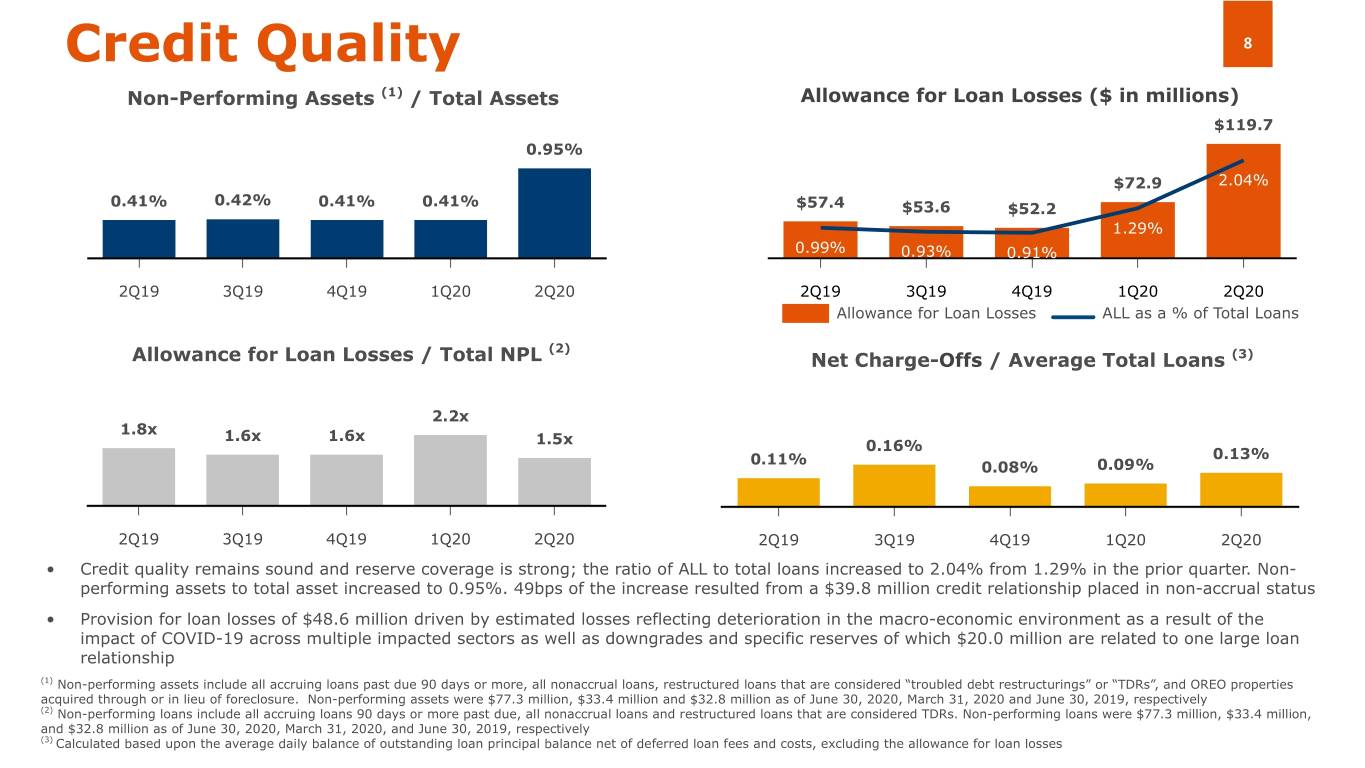 Appendix 1 29 Non-GAAP Financial Measures Reconciliations (cont’d) Three Months Ended, Six Months Ended June 30, ($ in thousands, except per share amounts and percentages) June 30, 2020 March 31, 2020 June 30, 2019 2020 2019 Salaries and employee benefits / Average total assets 1.06 % 1.48 % 1.74 % 1.27 % 1.71 % Less: impact of restructuring costs (0.01)% — % (0.05)% (0.01)% (0.02)% Adjusted salaries and employee benefits / Average total assets 1.05 % 1.48 % 1.69 % 1.26 % 1.69 % Other operating expenses / Average total assets 0.75 % 0.79 % 0.96 % 0.77 % 0.95 % Less: impact of restructuring costs (0.05)% (0.02)% (0.09)% (0.03)% (0.07)% Adjusted other operating expenses / Average total assets 0.70 % 0.77 % 0.87 % 0.74 % 0.88 % Efficiency ratio 55.60 % 63.07 % 77.87 % 59.47 % 76.80 % Less: impact of restructuring costs (1.99)% (0.50)% (4.03)% (1.21)% (2.69)% Adjusted efficiency ratio 53.61 % 62.57 % 73.84 % 58.26 % 74.11 % Stockholders' equity $ 830,198 $ 841,117 $ 806,368 $ 830,198 $ 806,368 Less: goodwill and other intangibles (21,653) (21,698) (20,969) (21,653) (20,969) Tangible common stockholders' equity $ 808,545 $ 819,419 $ 785,399 $ 808,545 $ 785,399 Total assets 8,130,723 8,098,810 7,926,826 8,130,723 7,926,826 Less: goodwill and other intangibles (21,653) (21,698) (20,969) (21,653) (20,969) Tangible assets $ 8,109,070 $ 8,077,112 $ 7,905,857 $ 8,109,070 $ 7,905,857 Common shares outstanding 42,159 42,166 43,205 42,159 43,205 Tangible common equity ratio 9.97 % 10.14 % 9.93 % 9.97 % 9.93 % Stockholders' book value per common share $ 19.69 $ 19.95 $ 18.66 $ 19.69 $ 18.66 Tangible stockholders' book value per common share $ 19.18 $ 19.43 $ 18.18 $ 19.18 $ 18.18