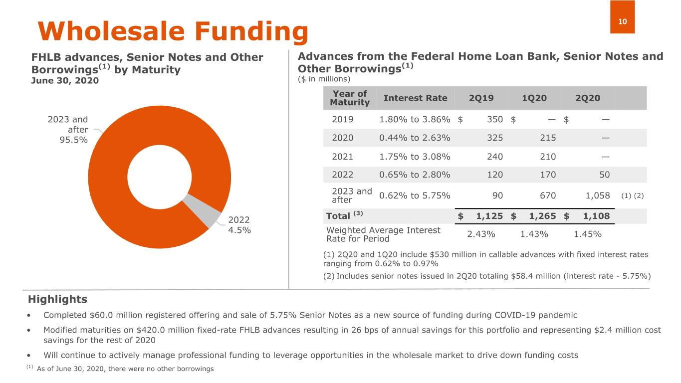 9 Interest-Earning Assets(1) ($ in millions, except for percentages ) 9,000 8,000 7,000 $1,651 $1,633 $1,739 $1,770 $1,675 6,000 $5,813 $5,754 $5,744 $5,668 $5,872 5,000 4.75% 4.64% 4,000 4.47% 4.31% 3,000 3.77% 2,000 2.85% 2.73% 2.66% 2.59% 2.50% 1,000 0 2Q19 3Q19 4Q19 1Q20 2Q20 Loans Investments Loan Yield Investment Yield • Loan yield decreased 54 basis points versus previous quarter, primarily due to the full quarter impact of repricing on variable-rate loans following the Federal Reserve’s emergency rate cuts in March 2020 • Investment yield declined primarily attributed to repricing of floating securities and reinvestments at lower market rates, partially offset by the purchase of higher-yielding corporate debt (1) Balances represent period-end outstanding amounts