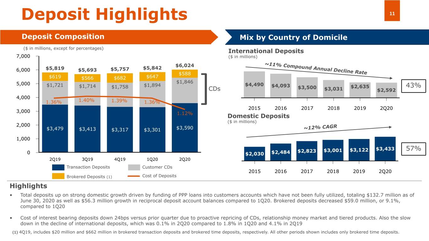 Wholesale Funding 10 FHLB advances, Senior Notes and Other Advances from the Federal Home Loan Bank, Senior Notes and Borrowings(1) by Maturity Other Borrowings(1) June 30, 2020 ($ in millions) Year of Maturity Interest Rate 2Q19 1Q20 2Q20 2023 and 2019 1.80% to 3.86% $ 350 $ — $ — after 95.5% 2020 0.44% to 2.63% 325 215 — 2021 1.75% to 3.08% 240 210 — 2022 0.65% to 2.80% 120 170 50 2023 and after 0.62% to 5.75% 90 670 1,058 (1) (2) (3) 2022 Total $ 1,125 $ 1,265 $ 1,108 4.5% Weighted Average Interest 2.43% 1.43% 1.45% Rate for Period (1) 2Q20 and 1Q20 include $530 million in callable advances with fixed interest rates ranging from 0.62% to 0.97% (2) Includes senior notes issued in 2Q20 totaling $58.4 million (interest rate - 5.75%) Highlights • Completed $60.0 million registered offering and sale of 5.75% Senior Notes as a new source of funding during COVID-19 pandemic • Modified maturities on $420.0 million fixed-rate FHLB advances resulting in 26 bps of annual savings for this portfolio and representing $2.4 million cost savings for the rest of 2020 • Will continue to actively manage professional funding to leverage opportunities in the wholesale market to drive down funding costs (1) As of June 30, 2020, there were no other borrowings