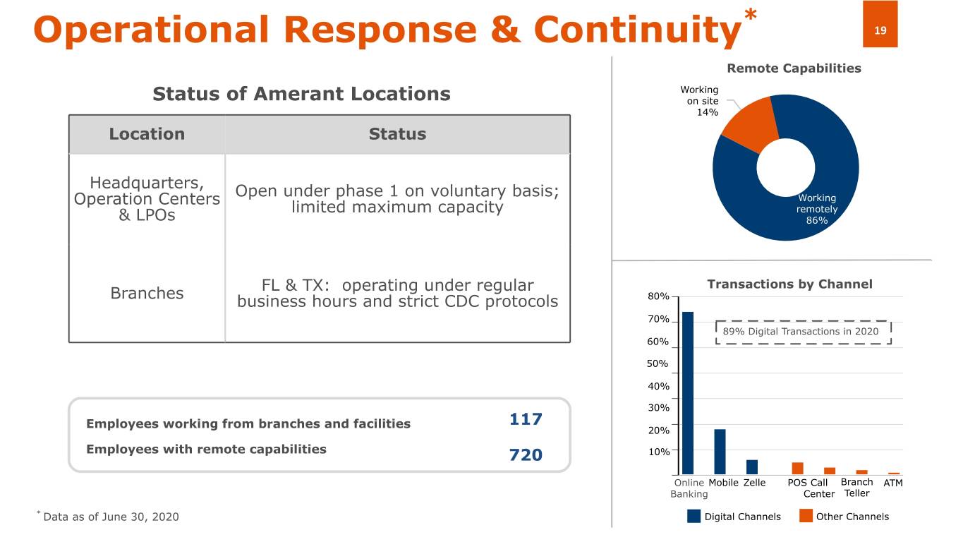 * Operational Response & Continuity 19 Remote Capabilities Working Status of Amerant Locations on site 14% Location Status Headquarters, Open under phase 1 on voluntary basis; Operation Centers Working limited maximum capacity remotely & LPOs 86% FL & TX: operating under regular Transactions by Channel Branches business hours and strict CDC protocols 80% 70% 89% Digital Transactions in 2020 60% 50% 40% 30% Employees working from branches and facilities 117 20% Employees with remote capabilities 720 10% Online Mobile Zelle POS Call Branch ATM Banking Center Teller * Data as of June 30, 2020 Digital Channels Other Channels