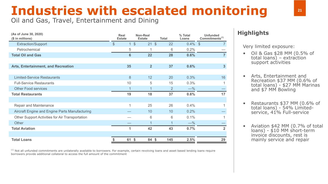 Loan portfolio by industry 20 (As of 06/30//2020) Real Non-Real % Total Unfunded Highlights ($ in millions) Estate Estate Total Loans Commitments(8) (1) Financial Sector $ 5 $ 74 $ 79 1.3% $ 17 • Diversified portfolio - highest Construction and Real Estate & Leasing: sector concentration, other Commercial real estate loans 2,949 — 2,949 50.2% 213 than real estate, at 11% of Other real estate related services and equipment leasing (2) 41 82 123 2.1% 22 total loans Total construction and real estate & leasing 2,990 82 3,072 52.3% 235 Manufacturing: • 76% of total loans secured by Foodstuffs, Apparel 74 29 103 1.8% 10 real estate Metals, Computer, Transportation and Other 14 102 116 2.0% 21 Chemicals, Oil, Plastics, Cement and Wood/Paper 25 14 39 0.7% 13 Total Manufacturing 113 145 258 4.5% 44 • Main concentrations: (3) Wholesale 166 504 670 11.4% 163 • CRE or Commercial Real (4) Retail Trade 271 152 423 7.2% 37 Estate Services: Communication, Transportation, Health and Other (5) 237 172 409 7.0% 31 • Wholesale - Food (6) Accommodation, Restaurants, Entertainment and other services 100 70 170 2.9% 24 • Retail - Gas stations Electricity, Gas, Water, Supply and Sewage Services 6 22 28 0.5% 4 Total Services 343 264 607 10.4% 59 • Services – Healthcare, Primary Products: Repair and Maintenance Agriculture, Livestock, Fishing and Forestry — — — —% — Mining — 4 4 0.1% — Total Primary Products — 4 4 0.1% — Other Loans (7) 591 167 758 12.8% 209 Total Loans $ 4,479 $ 1,392 $ 5,871 100.0% $ 764 (1) Consists mainly of finance facilities granted to non-bank financial companies. (2) Comprised mostly of construction and real estate related services and equipment rental and leasing activities (3) Food wholesalers represented approximately 45% (4) Gasoline stations represented approximately 58% (5) Healthcare represented approximately 57% (6) Other repair and maintenance services represented 52% (7) Primarily residential, consumer loans, and cash secured loans and loans belonging to industrial sectors not included in the above sectors, which do not individually represent more than 1 percent of the total loans portfolio (8) Not all unfunded commitments are unilaterally available to borrowers. For example, certain revolving loans and asset based lending loans require borrowers provide additional collateral to access the full amount of the commitment