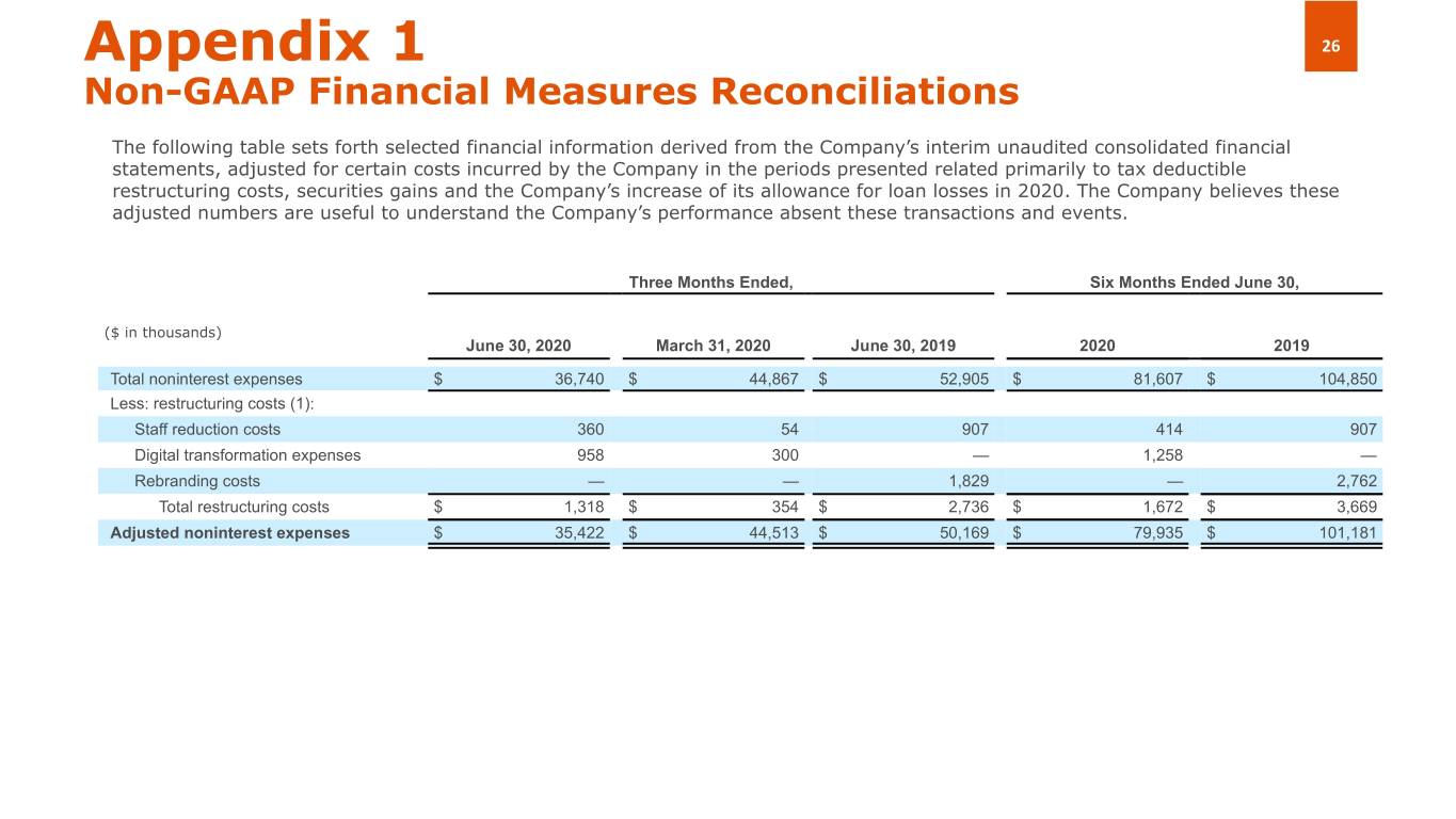 Appendix 1 26 Non-GAAP Financial Measures Reconciliations The following table sets forth selected financial information derived from the Company’s interim unaudited consolidated financial statements, adjusted for certain costs incurred by the Company in the periods presented related primarily to tax deductible restructuring costs, securities gains and the Company’s increase of its allowance for loan losses in 2020. The Company believes these adjusted numbers are useful to understand the Company’s performance absent these transactions and events. Three Months Ended, Six Months Ended June 30, ($ in thousands) June 30, 2020 March 31, 2020 June 30, 2019 2020 2019 Total noninterest expenses $ 36,740 $ 44,867 $ 52,905 $ 81,607 $ 104,850 Less: restructuring costs (1): Staff reduction costs 360 54 907 414 907 Digital transformation expenses 958 300 — 1,258 — Rebranding costs — — 1,829 — 2,762 Total restructuring costs $ 1,318 $ 354 $ 2,736 $ 1,672 $ 3,669 Adjusted noninterest expenses $ 35,422 $ 44,513 $ 50,169 $ 79,935 $ 101,181