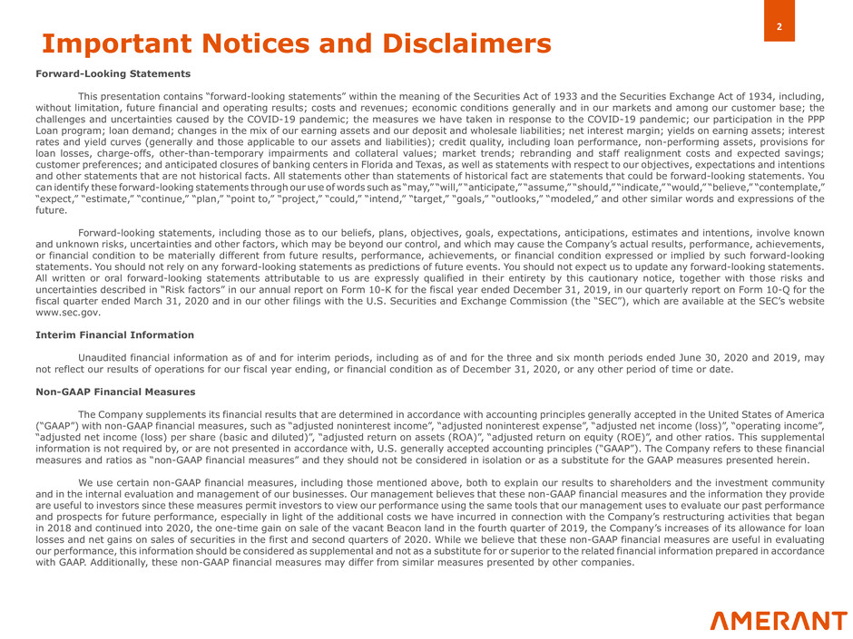 2 Forward-Looking Statements This presentation contains “forward-looking statements” within the meaning of the Securities Act of 1933 and the Securities Exchange Act of 1934, including, without limitation, future financial and operating results; costs and revenues; economic conditions generally and in our markets and among our customer base; the challenges and uncertainties caused by the COVID-19 pandemic; the measures we have taken in response to the COVID-19 pandemic; our participation in the PPP Loan program; loan demand; changes in the mix of our earning assets and our deposit and wholesale liabilities; net interest margin; yields on earning assets; interest rates and yield curves (generally and those applicable to our assets and liabilities); credit quality, including loan performance, non-performing assets, provisions for loan losses, charge-offs, other-than-temporary impairments and collateral values; market trends; rebranding and staff realignment costs and expected savings; customer preferences; and anticipated closures of banking centers in Florida and Texas, as well as statements with respect to our objectives, expectations and intentions and other statements that are not historical facts. All statements other than statements of historical fact are statements that could be forward-looking statements. You can identify these forward-looking statements through our use of words such as “may,” “will,” “anticipate,” “assume,” “should,” “indicate,” “would,” “believe,” “contemplate,” “expect,” “estimate,” “continue,” “plan,” “point to,” “project,” “could,” “intend,” “target,” “goals,” “outlooks,” “modeled,” and other similar words and expressions of the future. Forward-looking statements, including those as to our beliefs, plans, objectives, goals, expectations, anticipations, estimates and intentions, involve known and unknown risks, uncertainties and other factors, which may be beyond our control, and which may cause the Company’s actual results, performance, achievements, or financial condition to be materially different from future results, performance, achievements, or financial condition expressed or implied by such forward-looking statements. You should not rely on any forward-looking statements as predictions of future events. You should not expect us to update any forward-looking statements. All written or oral forward-looking statements attributable to us are expressly qualified in their entirety by this cautionary notice, together with those risks and uncertainties described in “Risk factors” in our annual report on Form 10-K for the fiscal year ended December 31, 2019, in our quarterly report on Form 10-Q for the fiscal quarter ended March 31, 2020 and in our other filings with the U.S. Securities and Exchange Commission (the “SEC”), which are available at the SEC’s website www.sec.gov. Interim Financial Information Unaudited financial information as of and for interim periods, including as of and for the three and six month periods ended June 30, 2020 and 2019, may not reflect our results of operations for our fiscal year ending, or financial condition as of December 31, 2020, or any other period of time or date. Non-GAAP Financial Measures The Company supplements its financial results that are determined in accordance with accounting principles generally accepted in the United States of America (“GAAP”) with non-GAAP financial measures, such as “adjusted noninterest income”, “adjusted noninterest expense”, “adjusted net income (loss)”, “operating income”, “adjusted net income (loss) per share (basic and diluted)”, “adjusted return on assets (ROA)”, “adjusted return on equity (ROE)”, and other ratios. This supplemental information is not required by, or are not presented in accordance with, U.S. generally accepted accounting principles (“GAAP”). The Company refers to these financial measures and ratios as “non-GAAP financial measures” and they should not be considered in isolation or as a substitute for the GAAP measures presented herein. We use certain non-GAAP financial measures, including those mentioned above, both to explain our results to shareholders and the investment community and in the internal evaluation and management of our businesses. Our management believes that these non-GAAP financial measures and the information they provide are useful to investors since these measures permit investors to view our performance using the same tools that our management uses to evaluate our past performance and prospects for future performance, especially in light of the additional costs we have incurred in connection with the Company’s restructuring activities that began in 2018 and continued into 2020, the one-time gain on sale of the vacant Beacon land in the fourth quarter of 2019, the Company’s increases of its allowance for loan losses and net gains on sales of securities in the first and second quarters of 2020. While we believe that these non-GAAP financial measures are useful in evaluating our performance, this information should be considered as supplemental and not as a substitute for or superior to the related financial information prepared in accordance with GAAP. Additionally, these non-GAAP financial measures may differ from similar measures presented by other companies. Important Notices and Disclaimers