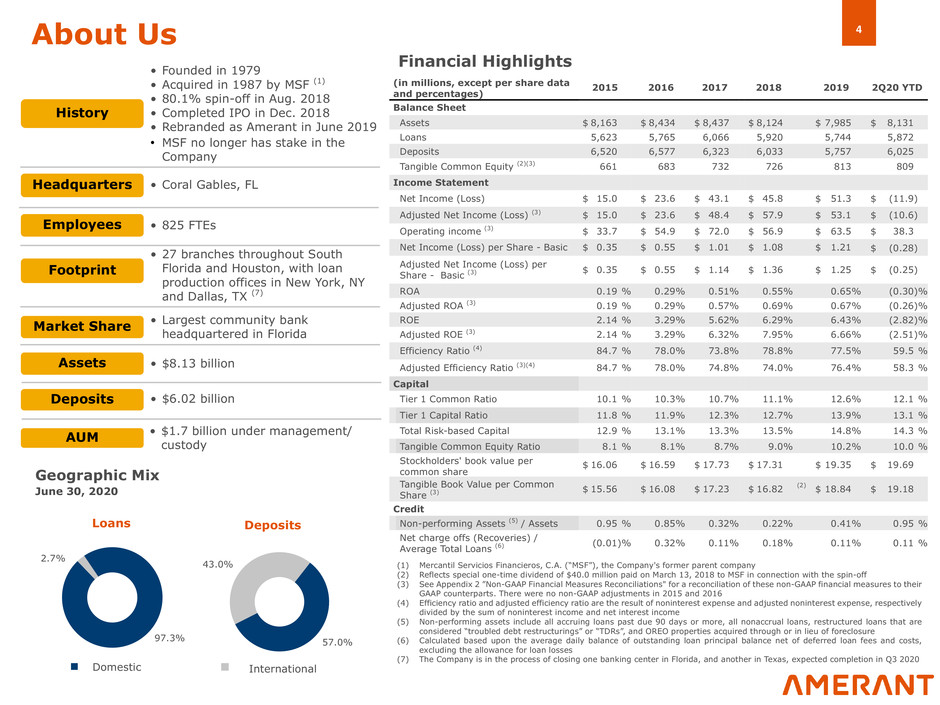 4 97.3% 2.7% 57.0% 43.0% Domestic • Largest community bank headquartered in Florida About Us • 27 branches throughout South Florida and Houston, with loan production offices in New York, NY and Dallas, TX (7) • $6.02 billion • $8.13 billion • Coral Gables, FL • 825 FTEs • $1.7 billion under management/ custody • Founded in 1979 • Acquired in 1987 by MSF (1) • 80.1% spin-off in Aug. 2018 • Completed IPO in Dec. 2018 • Rebranded as Amerant in June 2019 • MSF no longer has stake in the Company Footprint Assets Headquarters Employees Loans Deposits Geographic Mix Financial Highlights AUM (1) Mercantil Servicios Financieros, C.A. (“MSF”), the Company's former parent company (2) Reflects special one-time dividend of $40.0 million paid on March 13, 2018 to MSF in connection with the spin-off (3) See Appendix 2 ”Non-GAAP Financial Measures Reconciliations" for a reconciliation of these non-GAAP financial measures to their GAAP counterparts. There were no non-GAAP adjustments in 2015 and 2016 (4) Efficiency ratio and adjusted efficiency ratio are the result of noninterest expense and adjusted noninterest expense, respectively divided by the sum of noninterest income and net interest income (5) Non-performing assets include all accruing loans past due 90 days or more, all nonaccrual loans, restructured loans that are considered “troubled debt restructurings” or “TDRs”, and OREO properties acquired through or in lieu of foreclosure (6) Calculated based upon the average daily balance of outstanding loan principal balance net of deferred loan fees and costs, excluding the allowance for loan losses (7) The Company is in the process of closing one banking center in Florida, and another in Texas, expected completion in Q3 2020 Market Share History Deposits June 30, 2020 (in millions, except per share data and percentages) 2015 2016 2017 2018 2019 2Q20 YTD Balance Sheet Assets $ 8,163 $ 8,434 $ 8,437 $ 8,124 $ 7,985 $ 8,131 Loans 5,623 5,765 6,066 5,920 5,744 5,872 Deposits 6,520 6,577 6,323 6,033 5,757 6,025 Tangible Common Equity (2)(3) 661 683 732 726 813 809 Income Statement Net Income (Loss) $ 15.0 $ 23.6 $ 43.1 $ 45.8 $ 51.3 $ (11.9) Adjusted Net Income (Loss) (3) $ 15.0 $ 23.6 $ 48.4 $ 57.9 $ 53.1 $ (10.6) Operating income (3) $ 33.7 $ 54.9 $ 72.0 $ 56.9 $ 63.5 $ 38.3 Net Income (Loss) per Share - Basic $ 0.35 $ 0.55 $ 1.01 $ 1.08 $ 1.21 $ (0.28) Adjusted Net Income (Loss) per Share - Basic (3) $ 0.35 $ 0.55 $ 1.14 $ 1.36 $ 1.25 $ (0.25) ROA 0.19 % 0.29% 0.51% 0.55% 0.65% (0.30)% Adjusted ROA (3) 0.19 % 0.29% 0.57% 0.69% 0.67% (0.26)% ROE 2.14 % 3.29% 5.62% 6.29% 6.43% (2.82)% Adjusted ROE (3) 2.14 % 3.29% 6.32% 7.95% 6.66% (2.51)% Efficiency Ratio (4) 84.7 % 78.0% 73.8% 78.8% 77.5% 59.5 % Adjusted Efficiency Ratio (3)(4) 84.7 % 78.0% 74.8% 74.0% 76.4% 58.3 % Capital Tier 1 Common Ratio 10.1 % 10.3% 10.7% 11.1% 12.6% 12.1 % Tier 1 Capital Ratio 11.8 % 11.9% 12.3% 12.7% 13.9% 13.1 % Total Risk-based Capital 12.9 % 13.1% 13.3% 13.5% 14.8% 14.3 % Tangible Common Equity Ratio 8.1 % 8.1% 8.7% 9.0% 10.2% 10.0 % Stockholders' book value per common share $ 16.06 $ 16.59 $ 17.73 $ 17.31 $ 19.35 $ 19.69 Tangible Book Value per Common Share (3) $ 15.56 $ 16.08 $ 17.23 $ 16.82 (2) $ 18.84 $ 19.18 Credit Non-performing Assets (5) / Assets 0.95 % 0.85% 0.32% 0.22% 0.41% 0.95 % Net charge offs (Recoveries) / Average Total Loans (6) (0.01)% 0.32% 0.11% 0.18% 0.11% 0.11 % § § International