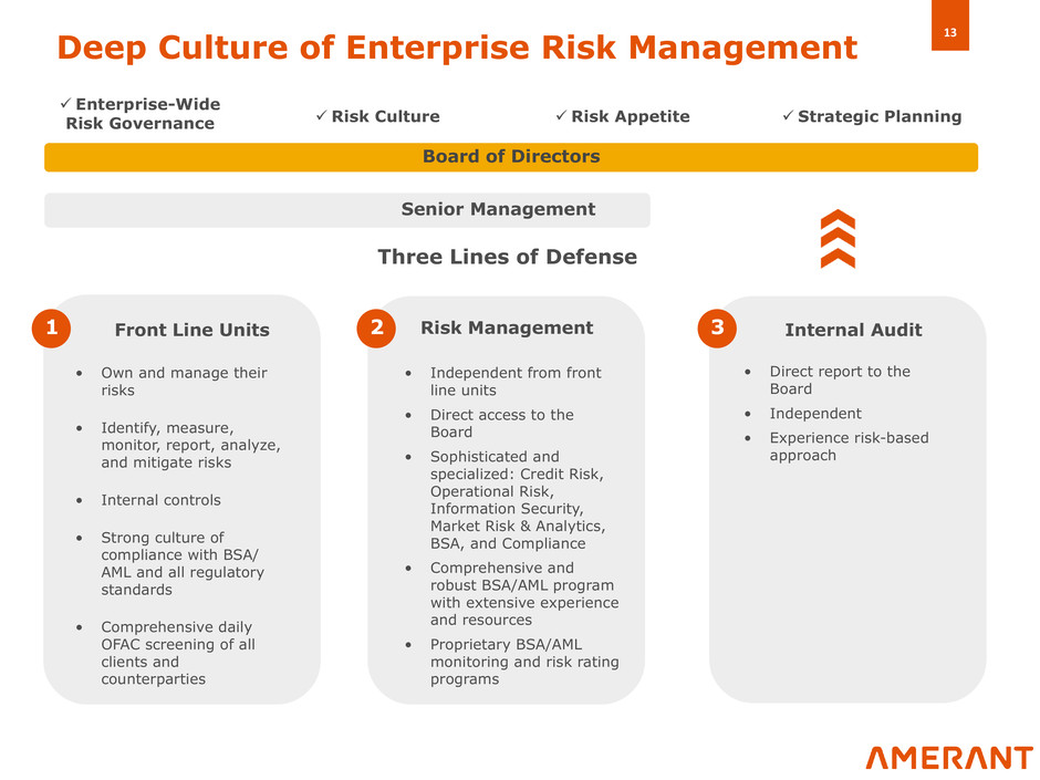 13Deep Culture of Enterprise Risk Management • Own and manage their risks • Identify, measure, monitor, report, analyze, and mitigate risks • Internal controls • Strong culture of compliance with BSA/ AML and all regulatory standards • Comprehensive daily OFAC screening of all clients and counterparties Front Line Units1 Three Lines of Defense • Independent from front line units • Direct access to the Board • Sophisticated and specialized: Credit Risk, Operational Risk, Information Security, Market Risk & Analytics, BSA, and Compliance • Comprehensive and robust BSA/AML program with extensive experience and resources • Proprietary BSA/AML monitoring and risk rating programs Risk Management2 • Direct report to the Board • Independent • Experience risk-based approach Internal Audit3 ü Risk Culture ü Risk Appetite ü Strategic Planningü Enterprise-Wide Risk Governance Board of Directors Senior Management