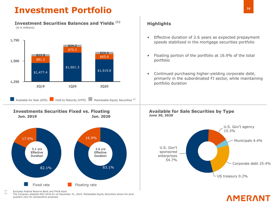 37 Appendix 2 Non-GAAP Financial Measures Reconciliations (cont’d) (in thousands, except per share data and percentages) 2Q20 YTD 2019 2018 2017 Efficiency ratio 59.47 % 77.47 % 78.77 % 73.84 % Less: impact of restructuring costs (1.21)% (1.89)% (2.34)% — % Less: impact of total spin-off costs — % — % (2.44)% (1.86)% Plus: gain on sale of vacant Beacon land — % 0.81 % — % — % Plus: gain on sale of New York building —% — % — % 2.78 % Adjusted efficiency ratio 58.26 % 76.39 % 73.99 % 74.76 % Total noninterest income $ 41,663 $ 57,110 $ 53,875 $ 71,485 Less: securities gains, net 7,737 2,605 (999) (1,601) Less: net gain on sale of properties — 2,795 — 10,469 Adjusted noninterest income for operating revenue $ 12,016 $ 51,710 $ 54,874 $ 62,617 Net interest income before provision 46,323 213,088 219,039 209,710 Operating revenue 58,339 264,798 273,913 272,327 Adjusted noninterest income as a % of operating revenue 20.6 % 19.5 % 20.0 % 23.0 % Tangible common equity ratio: Stockholders' equity $ 830,198 $ 834,701 $ 747,418 $ 753,450 Less: Goodwill and other intangibles (21,653) (21,744) (21,042) (21,186) Tangible common stockholders' equity $ 808,545 $ 812,957 $ 726,376 $ 732,264 Total assets 8,130,723 7,985,399 8,124,347 8,436,767 Less: Goodwill and other intangibles (21,653) (21,744) (21,042) (21,186) Tangible assets $ 8,109,070 $ 7,963,655 $ 8,103,305 $ 8,415,581 Common shares outstanding 42,159 43,146 43,183 42,489 Tangible common equity ratio 9.97 % 10.21 % 8.96 % 8.70 % Stockholders' book value per common share $ 19.69 $ 19.35 $ 17.31 $ 17.73 Tangible stockholders' book value per common share $ 19.18 $ 18.84 $ 16.82 $ 17.23 (1) Expenses incurred for actions designed to implement the Company’s strategy as a new independent company. These actions include, but are not limited to, reductions in workforce, streamlining operational processes, rolling out the Amerant brand, implementation of new technology system applications, enhanced sales tools and training, expanded product offerings and improved customer analytics to identify opportunities. (2) The spin-off caused an unexpected early distribution for U.S. federal income tax purposes from our deferred compensation plan. This distribution was taxable to plan participants as ordinary income during 2018. We partially compensated plan participants, in the aggregate amount of $1.2 million, for the higher tax expense they incurred as a result of the distribution increasing the plan participants' estimated effective federal income tax rates by recording a contribution to the plan on behalf of its participants. The after tax net effect of this $1.2 million contribution for the period ended September 30, 2018, was approximately $952,000. As a result of the early taxable distribution to plan participants, we expensed and deducted for federal income tax purposes, previously deferred compensation of approximately $8.1 million, resulting in an estimated tax credit of $1.7 million, which exceeded the amount of the tax gross-up paid to plan participants. (3) Calculated based upon the estimated annual effective tax rate for the periods, which excludes the tax effect of discrete items, and the amounts that resulted from the permanent difference between spin-off costs that are non-deductible for Federal and state income tax purposes, and total spin-off costs recognized in the consolidated financial statements. The estimated annual effective rate applied for the calculation differs from the reported effective tax rate since it is based on a different mix of statutory rates applicable to these expenses and to the rates applicable to the Company and its subsidiaries. (4) Calculated based upon an estimated annual effective rate of 31.71%. (5) As of June 30, 2020 and December 31, 2019, potential dilutive instruments consisted unvested shares of restricted stock and restricted stock units mainly related to the Company’s IPO in 2018, totaling 491,360 and 530,620, respectively. As of June 30, 2020, potential dilutive instruments were not included in the dilutive earnings per share computation because the Company reported a net loss and their inclusion would have an antidilutive effect. As of December 31, 2019, potential dilutive instruments were included in the diluted earnings per share computation because, when the unamortized deferred compensation cost related to these shares was divided by the average market price per share at those dates, fewer shares would have been purchased than restricted shares assumed issued. Therefore, at that date, such awards resulted in higher diluted weighted averages shares outstanding than basic weighted average shares outstanding, and had a dilutive effect in per share earnings. We had no outstanding dilutive instruments as of any period prior to December 2018.