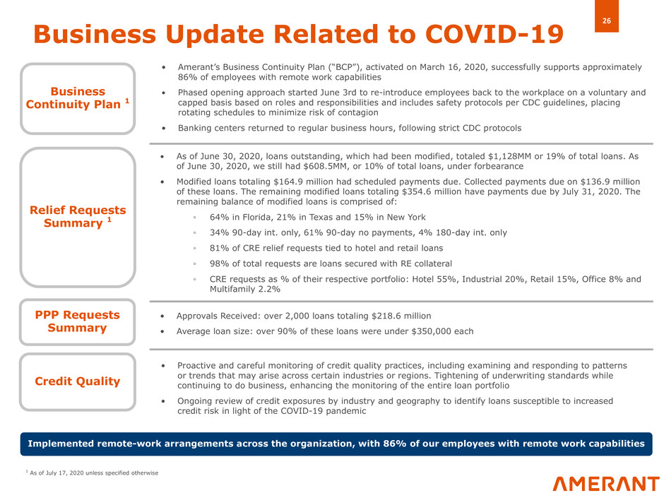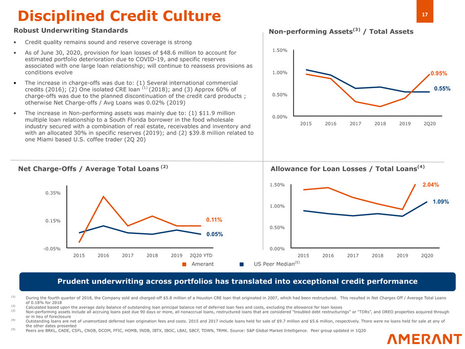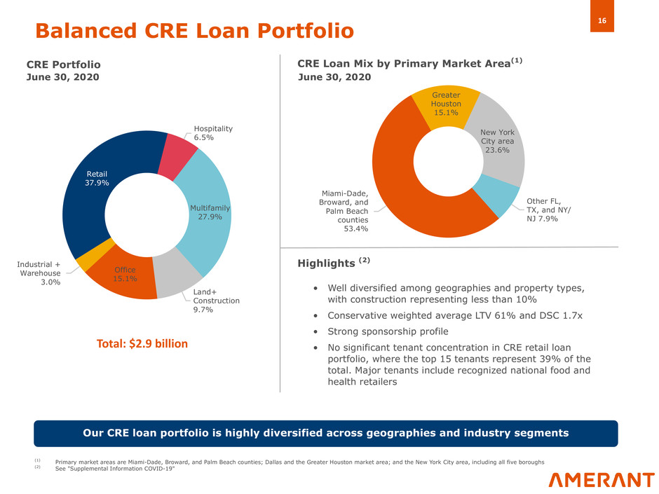 17 0.35% 0.15% -0.05% 2015 2016 2017 2018 2019 2Q20 YTD 0.05% 1.50% 1.00% 0.50% 0.00% 2015 2016 2017 2018 2019 2Q20 1.09% 1.50% 1.00% 0.50% 0.00% 2015 2016 2017 2018 2019 2Q20 US Peer Median(5)Amerant Disciplined Credit Culture Net Charge-Offs / Average Total Loans (2) Robust Underwriting Standards Non-performing Assets(3) / Total Assets Allowance for Loan Losses / Total Loans(4) • Credit quality remains sound and reserve coverage is strong • As of June 30, 2020, provision for loan losses of $48.6 million to account for estimated portfolio deterioration due to COVID-19, and specific reserves associated with one large loan relationship; will continue to reassess provisions as conditions evolve • The increase in charge-offs was due to: (1) Several international commercial credits (2016); (2) One isolated CRE loan (1) (2018); and (3) Approx 60% of charge-offs was due to the planned discontinuation of the credit card products ; otherwise Net Charge-offs / Avg Loans was 0.02% (2019) • The increase in Non-performing assets was mainly due to: (1) $11.9 million multiple loan relationship to a South Florida borrower in the food wholesale industry secured with a combination of real estate, receivables and inventory and with an allocated 30% in specific reserves (2019); and (2) $39.8 million related to one Miami based U.S. coffee trader (2Q 20) (1) During the fourth quarter of 2018, the Company sold and charged-off $5.8 million of a Houston CRE loan that originated in 2007, which had been restructured. This resulted in Net Charges Off / Average Total Loans of 0.18% for 2018 (2) Calculated based upon the average daily balance of outstanding loan principal balance net of deferred loan fees and costs, excluding the allowance for loan losses (3) Non-performing assets include all accruing loans past due 90 days or more, all nonaccrual loans, restructured loans that are considered “troubled debt restructurings” or “TDRs”, and OREO properties acquired through or in lieu of foreclosure (4) Outstanding loans are net of unamortized deferred loan origination fees and costs. 2015 and 2017 include loans held for sale of $9.7 million and $5.6 million, respectively. There were no loans held for sale at any of the other dates presented (5) Peers are BRKL, CADE, CSFL, CNOB, DCOM, FFIC, HOMB, INDB, IBTX, IBOC, LBAI, SBCF, TOWN, TRMK. Source: S&P Global Market Intelligence. Peer group updated in 1Q20 Prudent underwriting across portfolios has translated into exceptional credit performance 0.95% 2.04% 0.11% 0.55%