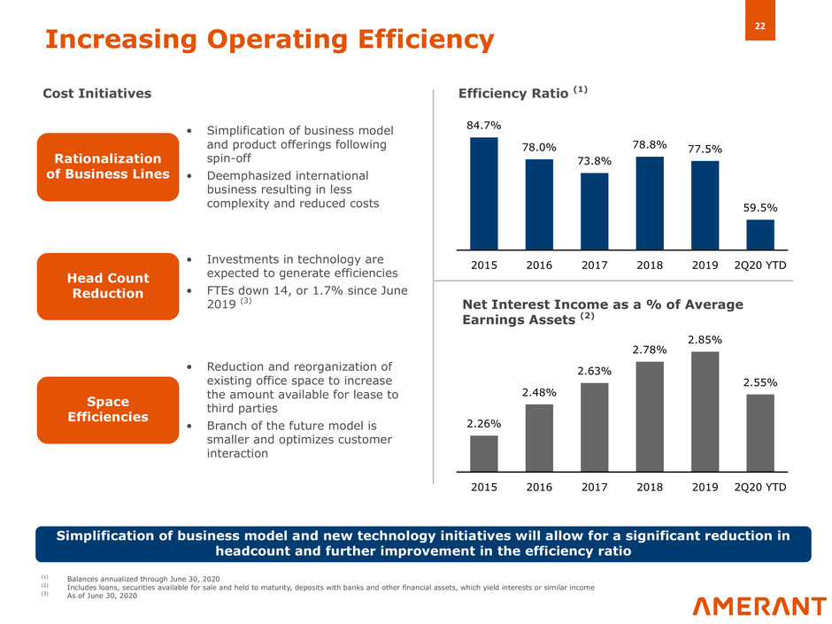 21 • Brokerage Services • Investment Advisory Services • Estate Planning • Asset Protection • Escrow Services escrow Wealth Management Franchise Expansion - Key Component of Noninterest Income Highlights • In 4Q19, acquired Grand Cayman-based trust company subsidiary, Elant Bank & Trust Ltd. $195 million in AUM acquired • $1.72 billion in assets under management/custody • Continue focus on domestic market to expand our footprint • Deposit and service fees also contribute significant portion to noninterest income • Brokerage and advisory fees continue to increase due to improved allocation of assets under management into advisory services and higher volume of customer trading activity, supported by online platform 2020 YTD Noninterest Income MixWealth Management Platform Noninterest Income as a % of Operating Revenue (1)(2)(3) Amerant Investments Total: $41.7 million (1) Peers are BRKL, CADE, CSFL, CNOB, DCOM, FFIC, HOMB, INDB, IBTX, IBOC, LBAI, SBCF, TOWN, TRMK. Source: S&P Global Market Intelligence and is adjusted to exclude all securities gains and losses. Peer group updated in 1Q20 (2) Operating revenue is the result of net interest income before provision for loan losses plus noninterest income. Noninterest income excludes net securities gains of $17.4 million in 2Q20 YTD. Years 2019, 2018, 2017, 2016 and 2015 exclude net securities gains and (losses) of $2.6 million, $(1.0) million, $(1.6) million, $1.0 million and $1.1 million, respectively. Years 2019 and 2017, also exclude $2.8 million gain on sale of vacant Beacon land and $10.5 million gain on sale of the NY building, respectively. (3) 2Q20 YTD includes $2.4 million fee income from derivative transactions sold to customers Amerant Trust Expansion of fee income capabilities a key focal point and growth lever Amerant Peer Median Deposits and service fees 18.6% Brokerage,advisory, and fiduciary activities 20.3% Other non- interest income 61.1% 2015 2016 2017 2018 2019 2Q20 YTD 23.8% 24.2% 23.0% 20.0% 19.5% 20.3% 17.4% 26.6% 23.8% 21.2% 15.8% 15.3%