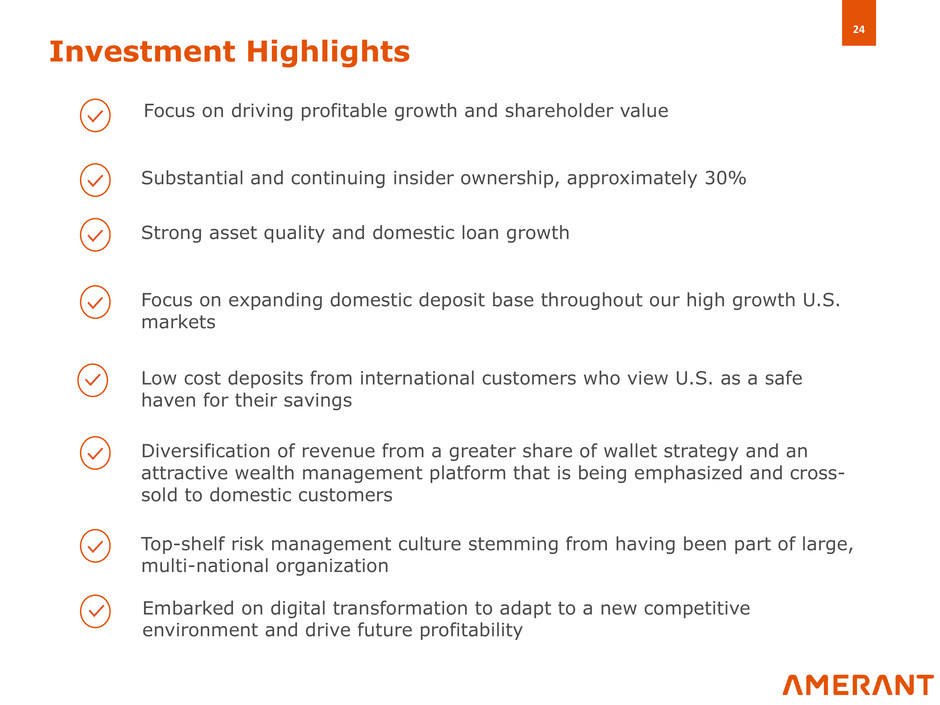 24 Investment Highlights Focus on driving profitable growth and shareholder value Top-shelf risk management culture stemming from having been part of large, multi-national organization Diversification of revenue from a greater share of wallet strategy and an attractive wealth management platform that is being emphasized and cross- sold to domestic customers Low cost deposits from international customers who view U.S. as a safe haven for their savings Focus on expanding domestic deposit base throughout our high growth U.S. markets Strong asset quality and domestic loan growth Substantial and continuing insider ownership, approximately 30% Embarked on digital transformation to adapt to a new competitive environment and drive future profitability