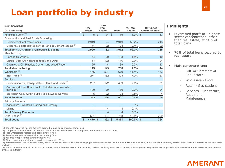 26 Business Update Related to COVID-19 • Amerant’s Business Continuity Plan (“BCP”), activated on March 16, 2020, successfully supports approximately 86% of employees with remote work capabilities • Phased opening approach started June 3rd to re-introduce employees back to the workplace on a voluntary and capped basis based on roles and responsibilities and includes safety protocols per CDC guidelines, placing rotating schedules to minimize risk of contagion • Banking centers returned to regular business hours, following strict CDC protocols • As of June 30, 2020, loans outstanding, which had been modified, totaled $1,128MM or 19% of total loans. As of June 30, 2020, we still had $608.5MM, or 10% of total loans, under forbearance • Modified loans totaling $164.9 million had scheduled payments due. Collected payments due on $136.9 million of these loans. The remaining modified loans totaling $354.6 million have payments due by July 31, 2020. The remaining balance of modified loans is comprised of: ◦ 64% in Florida, 21% in Texas and 15% in New York ◦ 34% 90-day int. only, 61% 90-day no payments, 4% 180-day int. only ◦ 81% of CRE relief requests tied to hotel and retail loans ◦ 98% of total requests are loans secured with RE collateral ◦ CRE requests as % of their respective portfolio: Hotel 55%, Industrial 20%, Retail 15%, Office 8% and Multifamily 2.2% • Approvals Received: over 2,000 loans totaling $218.6 million • Average loan size: over 90% of these loans were under $350,000 each Business Continuity Plan 1 Relief Requests Summary 1 PPP Requests Summary Credit Quality • Proactive and careful monitoring of credit quality practices, including examining and responding to patterns or trends that may arise across certain industries or regions. Tightening of underwriting standards while continuing to do business, enhancing the monitoring of the entire loan portfolio • Ongoing review of credit exposures by industry and geography to identify loans susceptible to increased credit risk in light of the COVID-19 pandemic 1 As of July 17, 2020 unless specified otherwise Implemented remote-work arrangements across the organization, with 86% of our employees with remote work capabilities