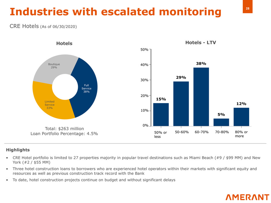 28Industries with escalated monitoring CRE Hotels (As of 06/30/2020) • CRE Hotel portfolio is limited to 27 properties majority in popular travel destinations such as Miami Beach (#9 / $99 MM) and New York (#2 / $55 MM) • Three hotel construction loans to borrowers who are experienced hotel operators within their markets with significant equity and resources as well as previous construction track record with the Bank • To date, hotel construction projects continue on budget and without significant delays Highlights Full Service 38% Limited Service 33% Boutique 29% Hotels 15% 29% 38% 5% 12% 50% 40% 30% 20% 10% 0% 50% or less 50-60% 60-70% 70-80% 80% or more Hotels - LTV Total: $263 million Loan Portfolio Percentage: 4.5%