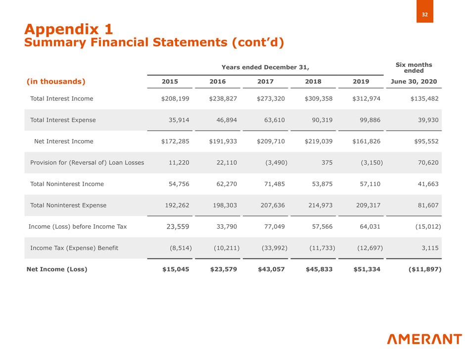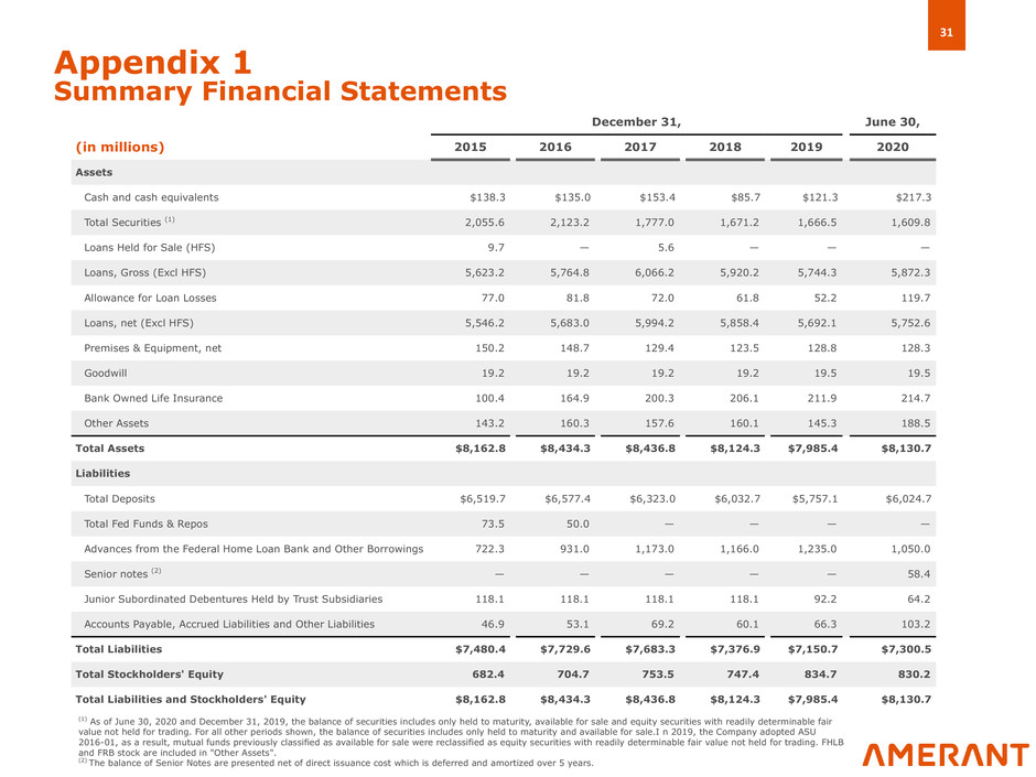 31 Appendix 1 Summary Financial Statements (1) As of June 30, 2020 and December 31, 2019, the balance of securities includes only held to maturity, available for sale and equity securities with readily determinable fair value not held for trading. For all other periods shown, the balance of securities includes only held to maturity and available for sale.I n 2019, the Company adopted ASU 2016-01, as a result, mutual funds previously classified as available for sale were reclassified as equity securities with readily determinable fair value not held for trading. FHLB and FRB stock are included in "Other Assets". (2) The balance of Senior Notes are presented net of direct issuance cost which is deferred and amortized over 5 years. December 31, June 30, (in millions) 2015 2016 2017 2018 2019 2020 Assets Cash and cash equivalents $138.3 $135.0 $153.4 $85.7 $121.3 $217.3 Total Securities (1) 2,055.6 2,123.2 1,777.0 1,671.2 1,666.5 1,609.8 Loans Held for Sale (HFS) 9.7 — 5.6 — — — Loans, Gross (Excl HFS) 5,623.2 5,764.8 6,066.2 5,920.2 5,744.3 5,872.3 Allowance for Loan Losses 77.0 81.8 72.0 61.8 52.2 119.7 Loans, net (Excl HFS) 5,546.2 5,683.0 5,994.2 5,858.4 5,692.1 5,752.6 Premises & Equipment, net 150.2 148.7 129.4 123.5 128.8 128.3 Goodwill 19.2 19.2 19.2 19.2 19.5 19.5 Bank Owned Life Insurance 100.4 164.9 200.3 206.1 211.9 214.7 Other Assets 143.2 160.3 157.6 160.1 145.3 188.5 Total Assets $8,162.8 $8,434.3 $8,436.8 $8,124.3 $7,985.4 $8,130.7 Liabilities Total Deposits $6,519.7 $6,577.4 $6,323.0 $6,032.7 $5,757.1 $6,024.7 Total Fed Funds & Repos 73.5 50.0 — — — — Advances from the Federal Home Loan Bank and Other Borrowings 722.3 931.0 1,173.0 1,166.0 1,235.0 1,050.0 Senior notes (2) — — — — — 58.4 Junior Subordinated Debentures Held by Trust Subsidiaries 118.1 118.1 118.1 118.1 92.2 64.2 Accounts Payable, Accrued Liabilities and Other Liabilities 46.9 53.1 69.2 60.1 66.3 103.2 Total Liabilities $7,480.4 $7,729.6 $7,683.3 $7,376.9 $7,150.7 $7,300.5 Total Stockholders' Equity 682.4 704.7 753.5 747.4 834.7 830.2 Total Liabilities and Stockholders' Equity $8,162.8 $8,434.3 $8,436.8 $8,124.3 $7,985.4 $8,130.7
