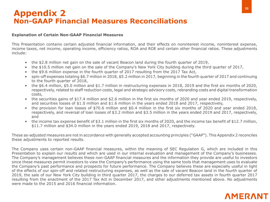 32 Appendix 1 Summary Financial Statements (cont’d) Years ended December 31, Six monthsended (in thousands) 2015 2016 2017 2018 2019 June 30, 2020 Total Interest Income $208,199 $238,827 $273,320 $309,358 $312,974 $135,482 Total Interest Expense 35,914 46,894 63,610 90,319 99,886 39,930 Net Interest Income $172,285 $191,933 $209,710 $219,039 $161,826 $95,552 Provision for (Reversal of) Loan Losses 11,220 22,110 (3,490) 375 (3,150) 70,620 Total Noninterest Income 54,756 62,270 71,485 53,875 57,110 41,663 Total Noninterest Expense 192,262 198,303 207,636 214,973 209,317 81,607 Income (Loss) before Income Tax 23,559 33,790 77,049 57,566 64,031 (15,012) Income Tax (Expense) Benefit (8,514) (10,211) (33,992) (11,733) (12,697) 3,115 Net Income (Loss) $15,045 $23,579 $43,057 $45,833 $51,334 ($11,897)