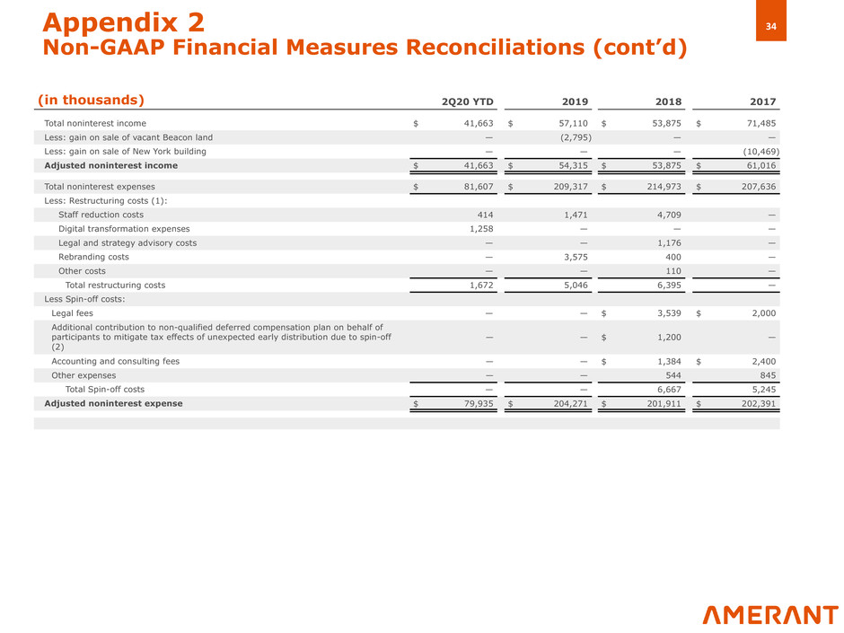33 Appendix 2 Non-GAAP Financial Measures Reconciliations Explanation of Certain Non-GAAP Financial Measures This Presentation contains certain adjusted financial information, and their effects on noninterest income, noninterest expense, income taxes, net income, operating income, efficiency ratios, ROA and ROE and certain other financial ratios. These adjustments include: • the $2.8 million net gain on the sale of vacant Beacon land during the fourth quarter of 2019, • the $10.5 million net gain on the sale of the Company’s New York City building during the third quarter of 2017, • the $9.6 million expense in the fourth quarter of 2017 resulting from the 2017 Tax Act, • spin-off expenses totaling $6.7 million in 2018, $5.2 million in 2017, beginning in the fourth quarter of 2017 and continuing to the fourth quarter of 2018, • the $6.4 million, $5.0 million and $1.7 million in restructuring expenses in 2018, 2019 and the first six months of 2020, respectively, related to staff reduction costs, legal and strategic advisory costs, rebranding costs and digital transformation costs, • the securities gains of $17.4 million and $2.6 million in the first six months of 2020 and year ended 2019, respectively, and securities losses of $1.0 million and $1.6 million in the years ended 2018 and 2017, respectively, • the provision for loan losses of $70.6 million and $0.4 million in the first six months of 2020 and year ended 2018, respectively, and reversal of loan losses of $3.2 million and $3.5 million in the years ended 2019 and 2017, respectively, and • the income tax expense benefit of $3.1 million in the first six months of 2020, and the income tax benefit of $12.7 million, $11.7 million and $34.0 million in the years ended 2019, 2018 and 2017, respectively. These as-adjusted measures are not in accordance with generally accepted accounting principles (“GAAP”). This Appendix 2 reconciles these adjustments to reported results. The Company uses certain non-GAAP financial measures, within the meaning of SEC Regulation G, which are included in this Presentation to explain our results and which are used in our internal evaluation and management of the Company’s businesses. The Company’s management believes these non-GAAP financial measures and the information they provide are useful to investors since these measures permit investors to view the Company’s performance using the same tools that management uses to evaluate the Company’s past performance and prospects for future performance. The Company believes these are especially useful in light of the effects of our spin-off and related restructuring expenses, as well as the sale of vacant Beacon land in the fourth quarter of 2019, the sale of our New York City building in third quarter 2017, the charges to our deferred tax assets in fourth quarter 2017 resulting from the enactment of the 2017 Tax Act in December 2017, and other adjustments mentioned above. No adjustments were made to the 2015 and 2016 financial information.