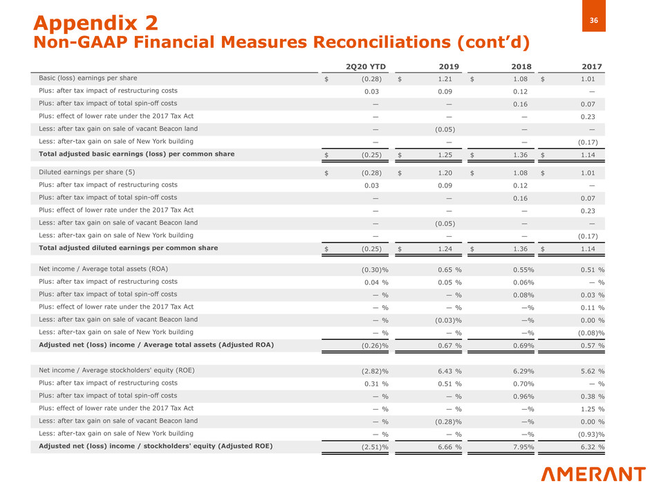 36Appendix 2 Non-GAAP Financial Measures Reconciliations (cont’d) 2Q20 YTD 2019 2018 2017 Basic (loss) earnings per share $ (0.28) $ 1.21 $ 1.08 $ 1.01 Plus: after tax impact of restructuring costs 0.03 0.09 0.12 — Plus: after tax impact of total spin-off costs — — 0.16 0.07 Plus: effect of lower rate under the 2017 Tax Act — — — 0.23 Less: after tax gain on sale of vacant Beacon land — (0.05) — — Less: after-tax gain on sale of New York building — — — (0.17) Total adjusted basic earnings (loss) per common share $ (0.25) $ 1.25 $ 1.36 $ 1.14 Diluted earnings per share (5) $ (0.28) $ 1.20 $ 1.08 $ 1.01 Plus: after tax impact of restructuring costs 0.03 0.09 0.12 — Plus: after tax impact of total spin-off costs — — 0.16 0.07 Plus: effect of lower rate under the 2017 Tax Act — — — 0.23 Less: after tax gain on sale of vacant Beacon land — (0.05) — — Less: after-tax gain on sale of New York building — — — (0.17) Total adjusted diluted earnings per common share $ (0.25) $ 1.24 $ 1.36 $ 1.14 Net income / Average total assets (ROA) (0.30)% 0.65 % 0.55% 0.51 % Plus: after tax impact of restructuring costs 0.04 % 0.05 % 0.06% — % Plus: after tax impact of total spin-off costs — % — % 0.08% 0.03 % Plus: effect of lower rate under the 2017 Tax Act — % — % —% 0.11 % Less: after tax gain on sale of vacant Beacon land — % (0.03)% —% 0.00 % Less: after-tax gain on sale of New York building — % — % —% (0.08)% Adjusted net (loss) income / Average total assets (Adjusted ROA) (0.26)% 0.67 % 0.69% 0.57 % Net income / Average stockholders' equity (ROE) (2.82)% 6.43 % 6.29% 5.62 % Plus: after tax impact of restructuring costs 0.31 % 0.51 % 0.70% — % Plus: after tax impact of total spin-off costs — % — % 0.96% 0.38 % Plus: effect of lower rate under the 2017 Tax Act — % — % —% 1.25 % Less: after tax gain on sale of vacant Beacon land — % (0.28)% —% 0.00 % Less: after-tax gain on sale of New York building — % — % —% (0.93)% Adjusted net (loss) income / stockholders' equity (Adjusted ROE) (2.51)% 6.66 % 7.95% 6.32 %