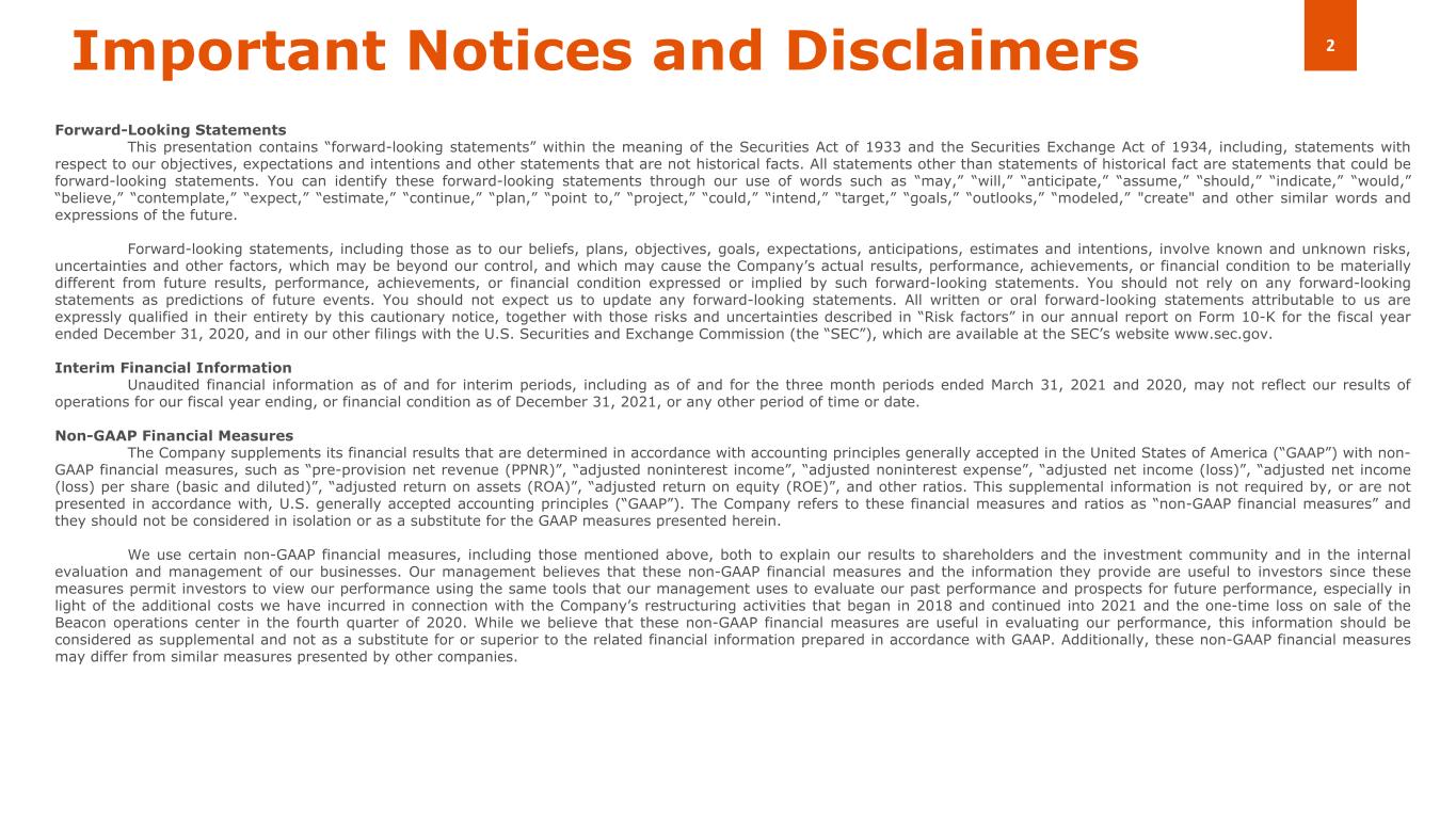 2 Forward-Looking Statements This presentation contains “forward-looking statements” within the meaning of the Securities Act of 1933 and the Securities Exchange Act of 1934, including, statements with respect to our objectives, expectations and intentions and other statements that are not historical facts. All statements other than statements of historical fact are statements that could be forward-looking statements. You can identify these forward-looking statements through our use of words such as “may,” “will,” “anticipate,” “assume,” “should,” “indicate,” “would,” “believe,” “contemplate,” “expect,” “estimate,” “continue,” “plan,” “point to,” “project,” “could,” “intend,” “target,” “goals,” “outlooks,” “modeled,” "create" and other similar words and expressions of the future. Forward-looking statements, including those as to our beliefs, plans, objectives, goals, expectations, anticipations, estimates and intentions, involve known and unknown risks, uncertainties and other factors, which may be beyond our control, and which may cause the Company’s actual results, performance, achievements, or financial condition to be materially different from future results, performance, achievements, or financial condition expressed or implied by such forward-looking statements. You should not rely on any forward-looking statements as predictions of future events. You should not expect us to update any forward-looking statements. All written or oral forward-looking statements attributable to us are expressly qualified in their entirety by this cautionary notice, together with those risks and uncertainties described in “Risk factors” in our annual report on Form 10-K for the fiscal year ended December 31, 2020, and in our other filings with the U.S. Securities and Exchange Commission (the “SEC”), which are available at the SEC’s website www.sec.gov. Interim Financial Information Unaudited financial information as of and for interim periods, including as of and for the three month periods ended March 31, 2021 and 2020, may not reflect our results of operations for our fiscal year ending, or financial condition as of December 31, 2021, or any other period of time or date. Non-GAAP Financial Measures The Company supplements its financial results that are determined in accordance with accounting principles generally accepted in the United States of America (“GAAP”) with non- GAAP financial measures, such as “pre-provision net revenue (PPNR)”, “adjusted noninterest income”, “adjusted noninterest expense”, “adjusted net income (loss)”, “adjusted net income (loss) per share (basic and diluted)”, “adjusted return on assets (ROA)”, “adjusted return on equity (ROE)”, and other ratios. This supplemental information is not required by, or are not presented in accordance with, U.S. generally accepted accounting principles (“GAAP”). The Company refers to these financial measures and ratios as “non-GAAP financial measures” and they should not be considered in isolation or as a substitute for the GAAP measures presented herein. We use certain non-GAAP financial measures, including those mentioned above, both to explain our results to shareholders and the investment community and in the internal evaluation and management of our businesses. Our management believes that these non-GAAP financial measures and the information they provide are useful to investors since these measures permit investors to view our performance using the same tools that our management uses to evaluate our past performance and prospects for future performance, especially in light of the additional costs we have incurred in connection with the Company’s restructuring activities that began in 2018 and continued into 2021 and the one-time loss on sale of the Beacon operations center in the fourth quarter of 2020. While we believe that these non-GAAP financial measures are useful in evaluating our performance, this information should be considered as supplemental and not as a substitute for or superior to the related financial information prepared in accordance with GAAP. Additionally, these non-GAAP financial measures may differ from similar measures presented by other companies. Important Notices and Disclaimers