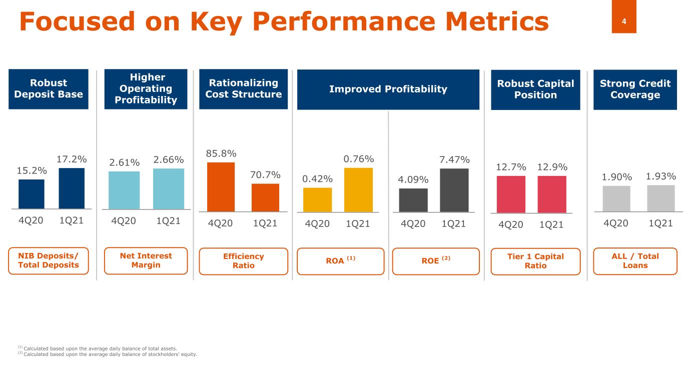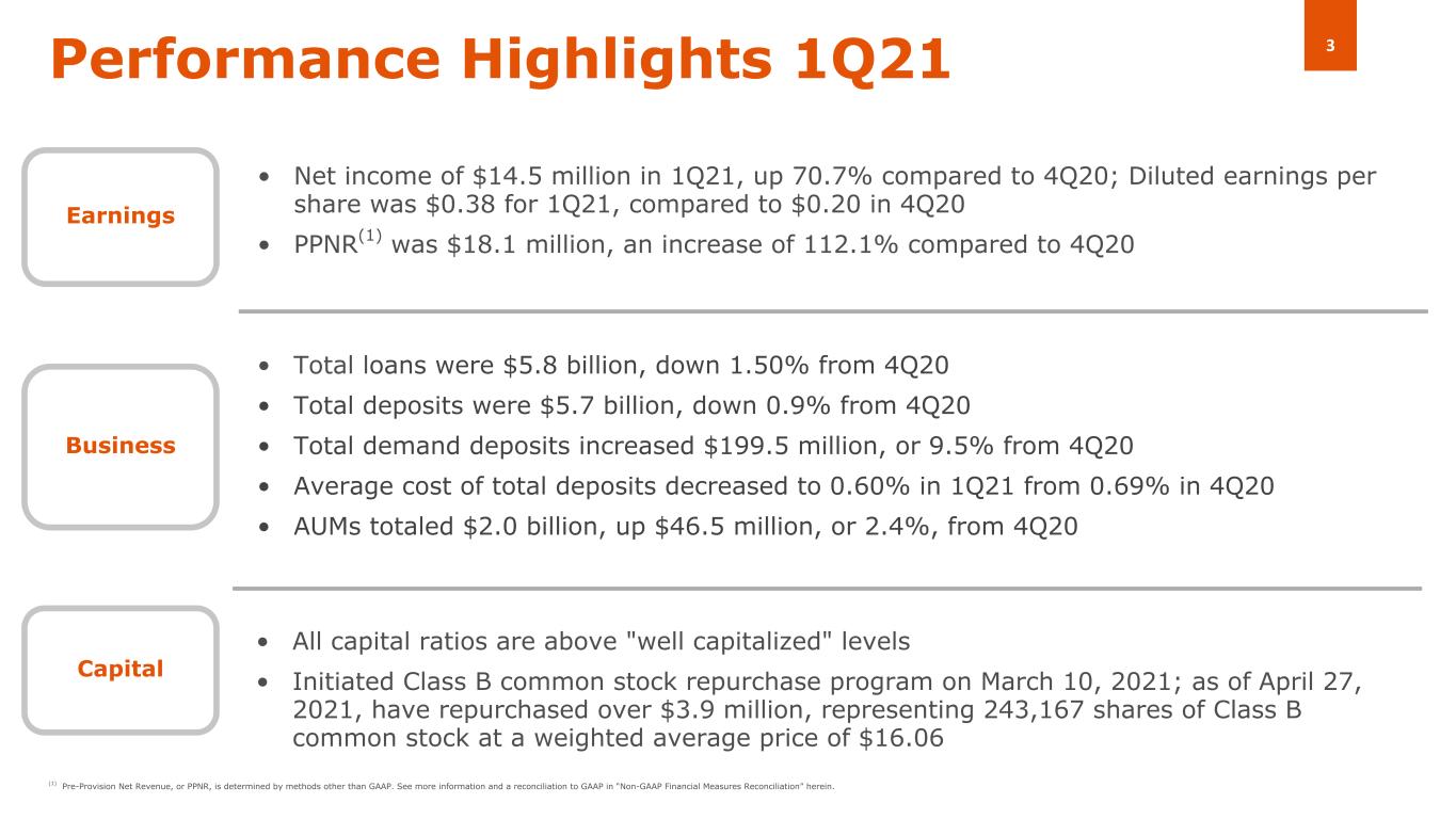 3 • All capital ratios are above "well capitalized" levels • Initiated Class B common stock repurchase program on March 10, 2021; as of April 27, 2021, have repurchased over $3.9 million, representing 243,167 shares of Class B common stock at a weighted average price of $16.06 Performance Highlights 1Q21 Capital Business • Net income of $14.5 million in 1Q21, up 70.7% compared to 4Q20; Diluted earnings per share was $0.38 for 1Q21, compared to $0.20 in 4Q20 • PPNR(1) was $18.1 million, an increase of 112.1% compared to 4Q20 • Total loans were $5.8 billion, down 1.50% from 4Q20 • Total deposits were $5.7 billion, down 0.9% from 4Q20 • Total demand deposits increased $199.5 million, or 9.5% from 4Q20 • Average cost of total deposits decreased to 0.60% in 1Q21 from 0.69% in 4Q20 • AUMs totaled $2.0 billion, up $46.5 million, or 2.4%, from 4Q20 Earnings (1) Pre-Provision Net Revenue, or PPNR, is determined by methods other than GAAP. See more information and a reconciliation to GAAP in “Non-GAAP Financial Measures Reconciliation” herein.