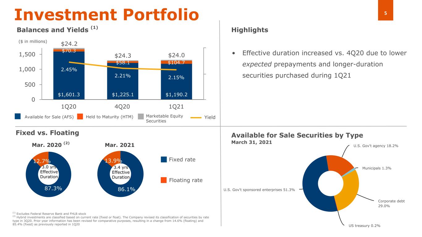 4 85.8% 70.7% 4Q20 1Q21 15.2% 17.2% 4Q20 1Q21 12.7% 12.9% 4Q20 1Q21 2.61% 2.66% 4Q20 1Q21 Focused on Key Performance Metrics Robust Deposit Base Robust Capital Position Higher Operating Profitability Rationalizing Cost Structure (1) Calculated based upon the average daily balance of total assets. (2) Calculated based upon the average daily balance of stockholders' equity. 1.90% 1.93% 4Q20 1Q21 Strong Credit Coverage 0.42% 0.76% 4Q20 1Q21 Improved Profitability 4.09% 7.47% 4Q20 1Q21 NIB Deposits/ Total Deposits Tier 1 Capital Ratio Net Interest Margin Efficiency Ratio ALL / Total LoansROA (1) ROE (2)