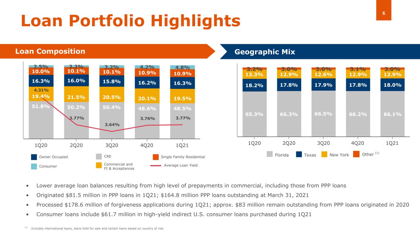 5 86.1% 13.9% U.S. Gov't sponsored enterprises 51.3% U.S. Gov't agency 18.2% Municipals 1.3% Corporate debt 29.0% US treasury 0.2% $1,601.3 $1,225.1 $1,190.2 $70.3 $58.1 $104.7 $24.2 $24.3 $24.0 2.45% 2.21% 2.15% 1Q20 4Q20 1Q21 0 500 1,000 1,500 87.3% 12.7% • Effective duration increased vs. 4Q20 due to lower expected prepayments and longer-duration securities purchased during 1Q21 Investment Portfolio Balances and Yields (1) Available for Sale (AFS) Held to Maturity (HTM) Highlights Fixed vs. Floating Mar. 2020 (2) Mar. 2021 Floating rate Fixed rate Available for Sale Securities by Type March 31, 2021 3.0 yrs Effective Duration ($ in millions) Marketable Equity Securities (1) Excludes Federal Reserve Bank and FHLB stock (2) Hybrid investments are classified based on current rate (fixed or float). The Company revised its classification of securities by rate type in 3Q20. Prior year information has been revised for comparative purposes, resulting in a change from 14.6% (floating) and 85.4% (fixed) as previously reported in 1Q20 Yield 3.4 yrs Effective Duration