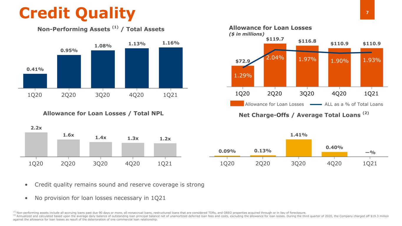 6 51.8% 50.2% 50.4% 48.6% 48.5% 19.4% 21.5% 20.5% 20.1% 19.5% 16.3% 16.0% 15.8% 16.2% 16.3% 10.0% 10.1% 10.1% 10.9% 10.9% 2.5% 2.2% 3.2% 4.2% 4.8% 4.31% 3.77% 3.64% 3.76% 3.77% 1Q20 2Q20 3Q20 4Q20 1Q21 65.3% 66.3% 66.5% 66.2% 66.1% 18.2% 17.8% 17.9% 17.8% 18.0% 13.3% 12.9% 12.6% 12.9% 12.9% 3.2% 3.0% 3.0% 3.1% 3.0% 1Q20 2Q20 3Q20 4Q20 1Q21 Consumer CRE Commercial and FI & Acceptances Owner Occupied Single Family Residential Loan Portfolio Highlights Loan Composition Geographic Mix (Domestic) • Lower average loan balances resulting from high level of prepayments in commercial, including those from PPP loans • Originated $81.5 million in PPP loans in 1Q21; $164.8 million PPP loans outstanding at March 31, 2021 • Processed $178.6 million of forgiveness applications during 1Q21; approx. $83 million remain outstanding from PPP loans originated in 2020 • Consumer loans include $61.7 million in high-yield indirect U.S. consumer loans purchased during 1Q21 Florida Texas New York Average Loan Yield Other (1) (1) Includes international loans, loans held for sale and certain loans based on country of risk.