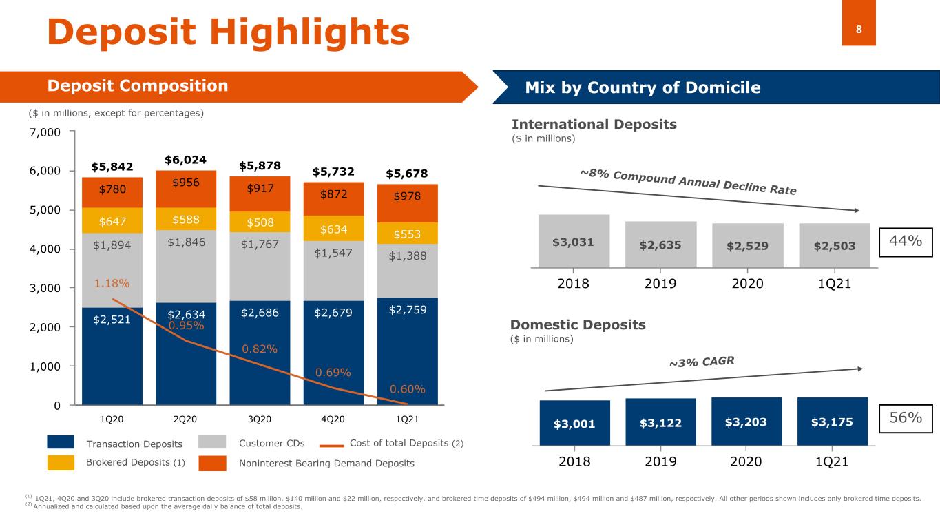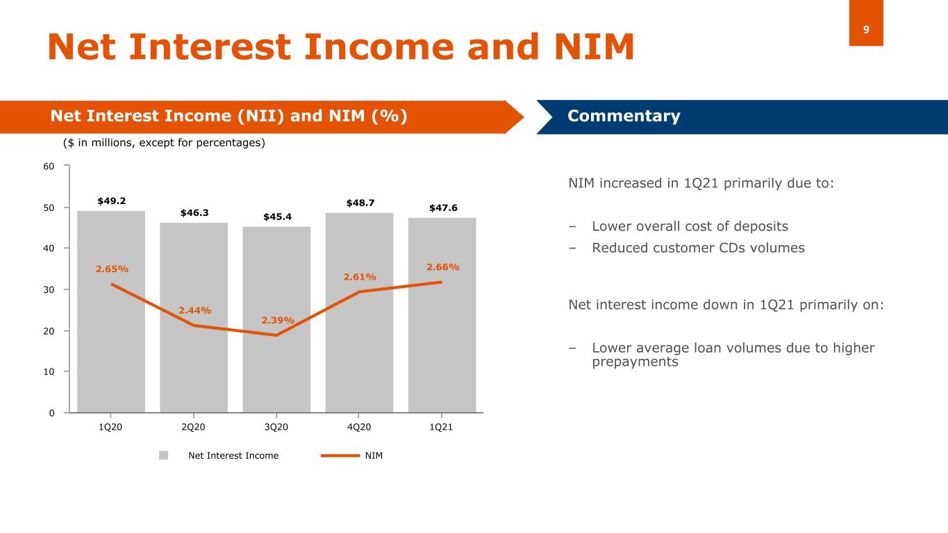 8 $5,842 $6,024 $5,878 $5,732 $5,678 $2,521 $2,634 $2,686 $2,679 $2,759 $1,894 $1,846 $1,767 $1,547 $1,388 $647 $588 $508 $634 $553 $780 $956 $917 $872 $978 1.18% 0.95% 0.82% 0.69% 0.60% 1Q20 2Q20 3Q20 4Q20 1Q21 0 1,000 2,000 3,000 4,000 5,000 6,000 7,000 $3,031 $2,635 $2,529 $2,503 2018 2019 2020 1Q21 $3,001 $3,122 $3,203 $3,175 2018 2019 2020 1Q21 ~3% CAGR Domestic Deposits ($ in millions) ~8% Compound Annual Decline Rate Deposit Highlights Deposit Composition 56% International Deposits ($ in millions) Mix by Country of Domicile Transaction Deposits Customer CDs Brokered Deposits (1) Cost of total Deposits (2) ($ in millions, except for percentages) 44% (1) 1Q21, 4Q20 and 3Q20 include brokered transaction deposits of $58 million, $140 million and $22 million, respectively, and brokered time deposits of $494 million, $494 million and $487 million, respectively. All other periods shown includes only brokered time deposits. (2) Annualized and calculated based upon the average daily balance of total deposits. Noninterest Bearing Demand Deposits