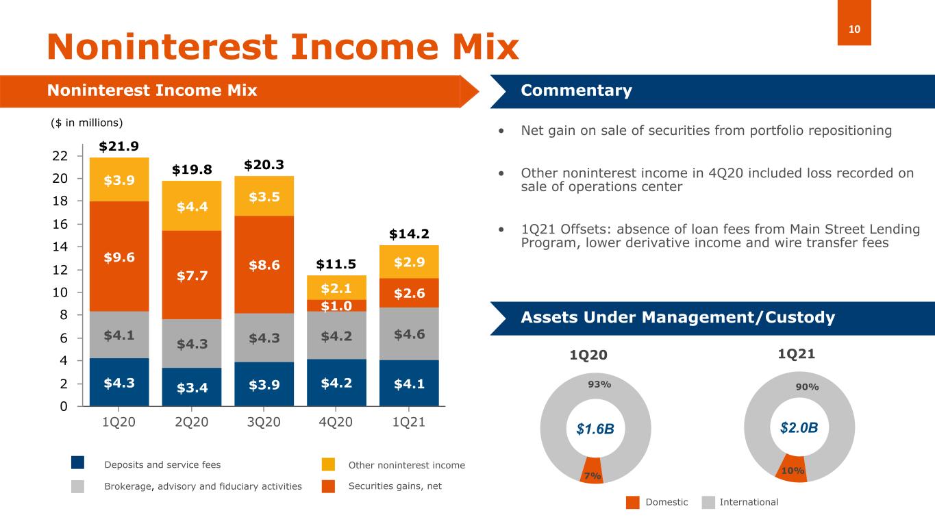9 $49.2 $46.3 $45.4 $48.7 $47.6 2.65% 2.44% 2.39% 2.61% 2.66% Net Interest Income NIM 1Q20 2Q20 3Q20 4Q20 1Q21 0 10 20 30 40 50 60 NIM increased in 1Q21 primarily due to: – Lower overall cost of deposits – Reduced customer CDs volumes Net interest income down in 1Q21 primarily on: – Lower average loan volumes due to higher prepayments Net Interest Income and NIM Net Interest Income (NII) and NIM (%) Commentary ($ in millions, except for percentages)