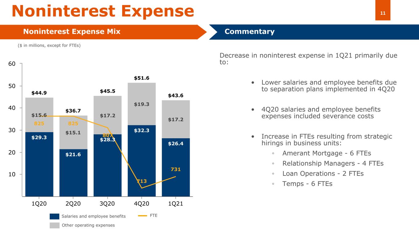 10 $21.9 $19.8 $20.3 $11.5 $14.2 $4.3 $3.4 $3.9 $4.2 $4.1 $4.1 $4.3 $4.3 $4.2 $4.6 $9.6 $7.7 $8.6 $1.0 $2.6 $3.9 $4.4 $3.5 $2.1 $2.9 1Q20 2Q20 3Q20 4Q20 1Q21 0 2 4 6 8 10 12 14 16 18 20 22 7% 93% 10% 90% Noninterest Income Mix Noninterest Income Mix Commentary • Net gain on sale of securities from portfolio repositioning • Other noninterest income in 4Q20 included loss recorded on sale of operations center • 1Q21 Offsets: absence of loan fees from Main Street Lending Program, lower derivative income and wire transfer fees Assets Under Management/Custody Deposits and service fees Brokerage, advisory and fiduciary activities Other noninterest income $2.0B Domestic International 1Q211Q20 $1.6B ($ in millions) Securities gains, net