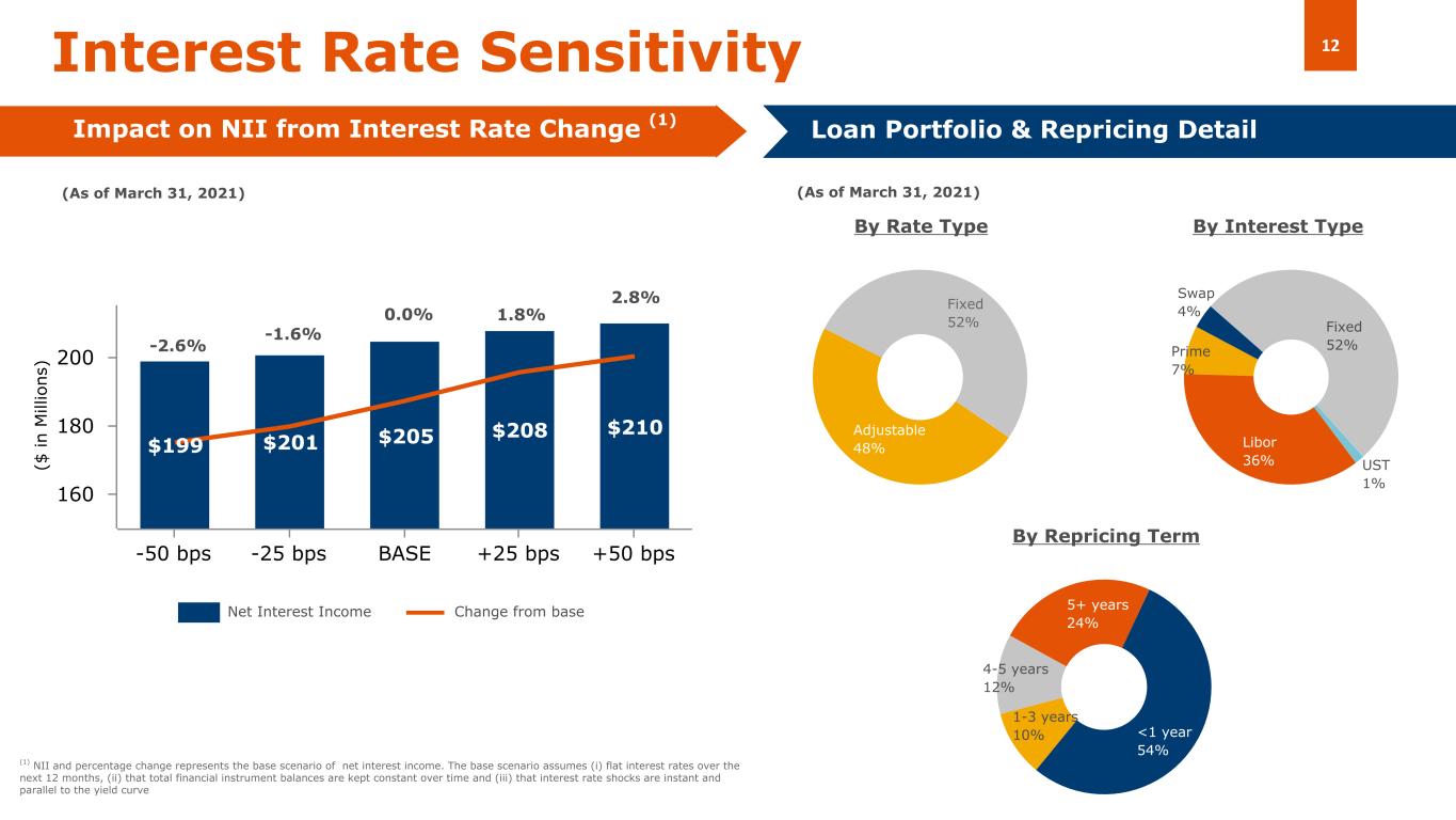 12 $199 $201 $205 $208 $210 -50 bps -25 bps BASE +25 bps +50 bps 160 180 200 (As of March 31, 2021) Fixed 52% Adjustable 48% Interest Rate Sensitivity By Interest TypeBy Rate Type By Repricing Term (1) NII and percentage change represents the base scenario of net interest income. The base scenario assumes (i) flat interest rates over the next 12 months, (ii) that total financial instrument balances are kept constant over time and (iii) that interest rate shocks are instant and parallel to the yield curve Loan Portfolio & Repricing Detail Impact on NII from Interest Rate Change (1) Net Interest Income Change from base <1 year 54% 1-3 years 10% 4-5 years 12% 5+ years 24% -2.6% -1.6% 0.0% 2.8% 1.8% ($ i n M ill io n s) (As of March 31, 2021) Swap 4% Fixed 52% UST 1% Libor 36% Prime 7%