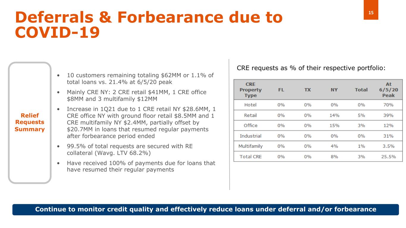 15Deferrals & Forbearance due to COVID-19 • 10 customers remaining totaling $62MM or 1.1% of total loans vs. 21.4% at 6/5/20 peak • Mainly CRE NY: 2 CRE retail $41MM, 1 CRE office $8MM and 3 multifamily $12MM • Increase in 1Q21 due to 1 CRE retail NY $28.6MM, 1 CRE office NY with ground floor retail $8.5MM and 1 CRE multifamily NY $2.4MM, partially offset by $20.7MM in loans that resumed regular payments after forbearance period ended • 99.5% of total requests are secured with RE collateral (Wavg. LTV 68.2%) • Have received 100% of payments due for loans that have resumed their regular payments Relief Requests Summary Continue to monitor credit quality and effectively reduce loans under deferral and/or forbearance CRE requests as % of their respective portfolio: