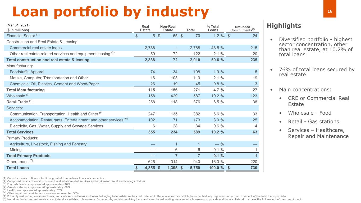 16Loan portfolio by industry • Diversified portfolio - highest sector concentration, other than real estate, at 10.2% of total loans • 76% of total loans secured by real estate • Main concentrations: • CRE or Commercial Real Estate • Wholesale - Food • Retail - Gas stations • Services – Healthcare, Repair and Maintenance Highlights (1) Consists mainly of finance facilities granted to non-bank financial companies. (2) Comprised mostly of construction and real estate related services and equipment rental and leasing activities (3) Food wholesalers represented approximately 40% (4) Gasoline stations represented approximately 60% (5) Healthcare represented approximately 57% (6) Other repair and maintenance services represented 53% (7) Primarily residential, consumer loans, and cash secured loans and loans belonging to industrial sectors not included in the above sectors, which do not individually represent more than 1 percent of the total loans portfolio (8) Not all unfunded commitments are unilaterally available to borrowers. For example, certain revolving loans and asset based lending loans require borrowers to provide additional collateral to access the full amount of the commitment ($ in millions) Real Estate Non-Real Estate Total % Total Loans Unfunded Commitments(8) Financial Sector (1) $ 5 $ 65 $ 70 1.2 % 2 4 $ 24 Construction and Real Estate & Leasing: Commercial real estate loans 2,788 — 2,788 48.5 % 215 Other real estate related services and equipment leasing (2) 50 72 122 2.1 % 20 Total construction and real estate & leasing 2,838 72 2,910 50.6 % 235 Manufacturing: Foodstuffs, Apparel 74 34 108 1.9 % 5 Metals, Computer, Transportation and Other 16 103 119 2.1 % 19 Chemicals, Oil, Plastics, Cement and Wood/Paper 26 19 45 0.8 % 3 Total Manufacturing 115 156 271 4.7 % 27 Wholesale (3) 158 429 587 10.2 % 123 Retail Trade (4) 258 118 376 6.5 % 38 Services: Communication, Transportation, Health and Other (5) 247 135 382 6.6 % 33 Accommodation, Restaurants, Entertainment and other services (6) 102 71 173 3.0 % 25 Electricity, Gas, Water, Supply and Sewage Services 6 28 34 0.6 % 4 Total Services 355 234 589 10.2 % 63 Primary Products: Agriculture, Livestock, Fishing and Forestry — 1 1 — % — Mining — 6 6 0.1 % 1 Total Primary Products — 7 7 0.1 % 1 Other Loans (7) 626 314 940 16.3 % 220 Total Loans $ 4,355 $ 1,395 $ 5,750 100.0 % $ 730 (Mar 31, 2021)