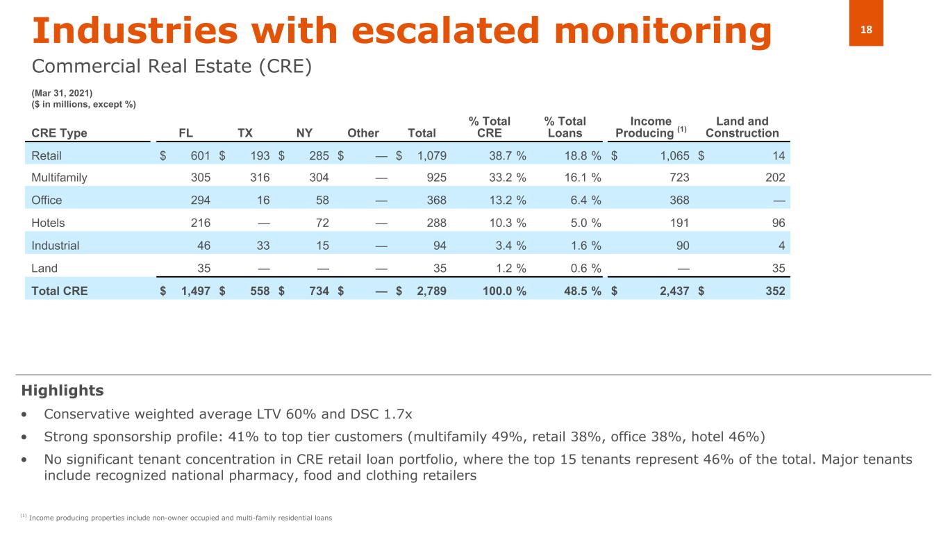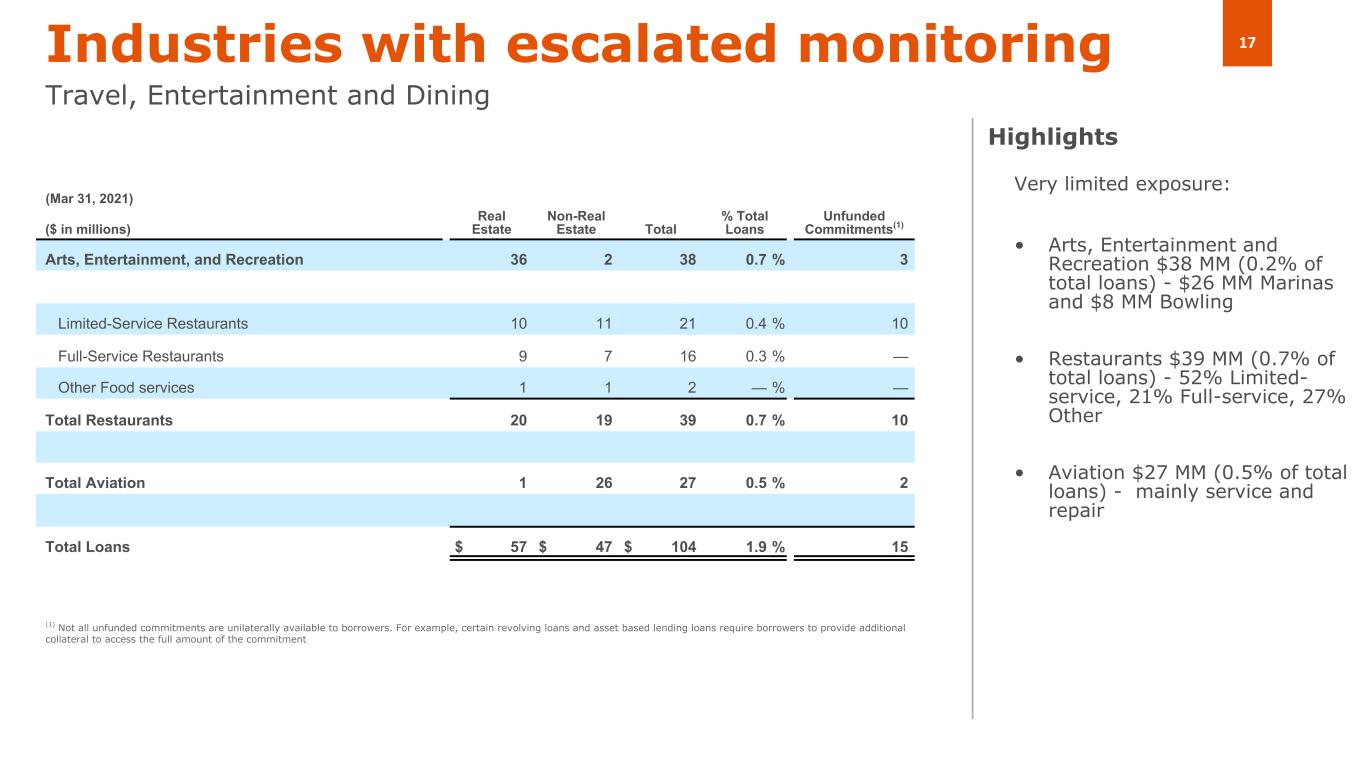 17Industries with escalated monitoring Travel, Entertainment and Dining Very limited exposure: • Arts, Entertainment and Recreation $38 MM (0.2% of total loans) - $26 MM Marinas and $8 MM Bowling • Restaurants $39 MM (0.7% of total loans) - 52% Limited- service, 21% Full-service, 27% Other • Aviation $27 MM (0.5% of total loans) - mainly service and repair Highlights (1) Not all unfunded commitments are unilaterally available to borrowers. For example, certain revolving loans and asset based lending loans require borrowers to provide additional collateral to access the full amount of the commitment ($ in millions) Real Estate Non-Real Estate Total % Total Loans Unfunded Commitments(1) Arts, Entertainment, and Recreation 36 2 38 0.7 % 3 Limited-Service Restaurants 10 11 21 0.4 % 10 Full-Service Restaurants 9 7 16 0.3 % — Other Food services 1 1 2 — % — Total Restaurants 20 19 39 0.7 % 10 Total Aviation 1 26 27 0.5 % 2 Total Loans $ 57 $ 47 $ 104 1.9 % 15 (Mar 31, 2021)