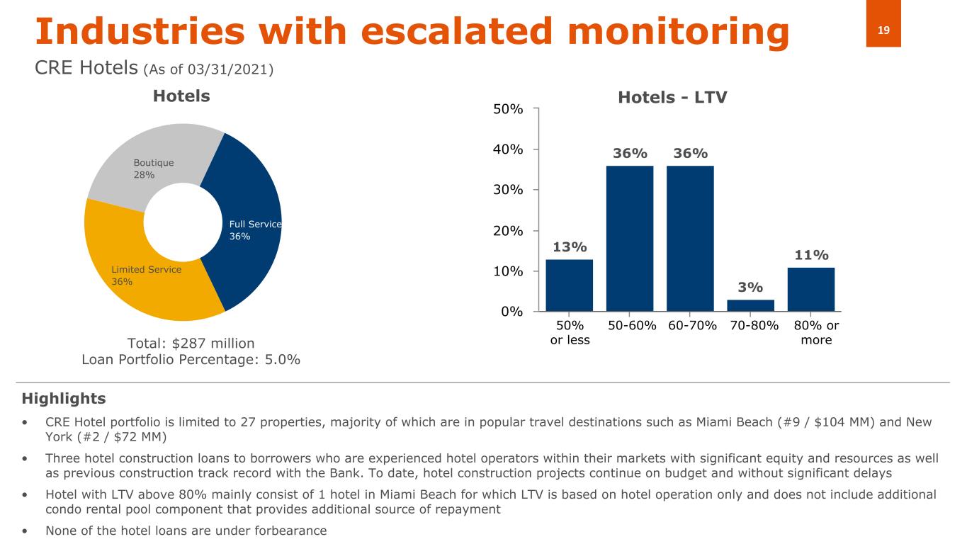 18Industries with escalated monitoring Commercial Real Estate (CRE) CRE Type FL TX NY Other Total % Total CRE % Total Loans Income Producing (1) Land and Construction Retail $ 601 $ 193 $ 285 $ — $ 1,079 38.7 % 18.8 % $ 1,065 $ 14 Multifamily 305 316 304 — 925 33.2 % 16.1 % 723 202 Office 294 16 58 — 368 13.2 % 6.4 % 368 — Hotels 216 — 72 — 288 10.3 % 5.0 % 191 96 Industrial 46 33 15 — 94 3.4 % 1.6 % 90 4 Land 35 — — — 35 1.2 % 0.6 % — 35 Total CRE $ 1,497 $ 558 $ 734 $ — $ 2,789 100.0 % 48.5 % $ 2,437 $ 352 • Conservative weighted average LTV 60% and DSC 1.7x • Strong sponsorship profile: 41% to top tier customers (multifamily 49%, retail 38%, office 38%, hotel 46%) • No significant tenant concentration in CRE retail loan portfolio, where the top 15 tenants represent 46% of the total. Major tenants include recognized national pharmacy, food and clothing retailers (1) Income producing properties include non-owner occupied and multi-family residential loans Highlights (Mar 31, 2021) ($ in millions, except %)