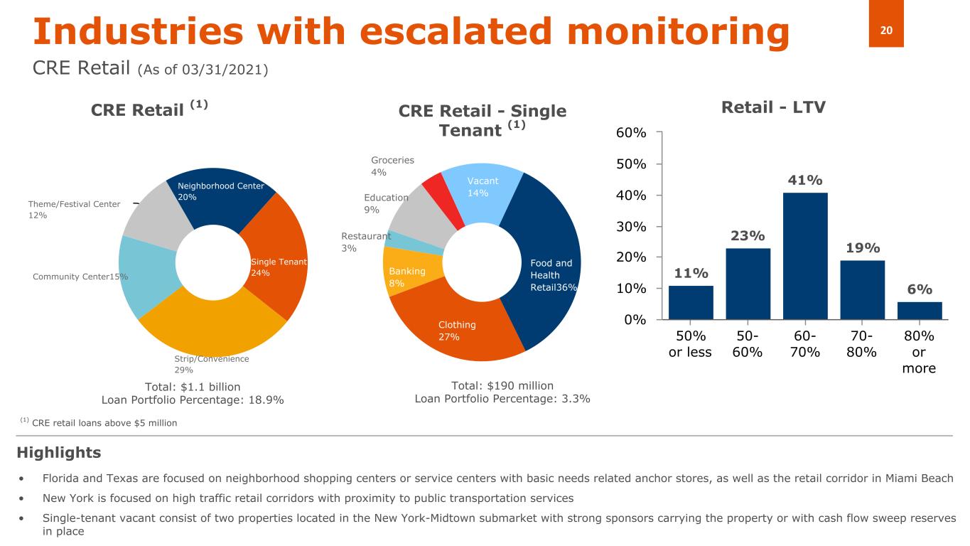 20 11% 23% 41% 19% 6% 50% or less 50- 60% 60- 70% 70- 80% 80% or more 0% 10% 20% 30% 40% 50% 60% Industries with escalated monitoring CRE Retail (As of 03/31/2021) • Florida and Texas are focused on neighborhood shopping centers or service centers with basic needs related anchor stores, as well as the retail corridor in Miami Beach • New York is focused on high traffic retail corridors with proximity to public transportation services • Single-tenant vacant consist of two properties located in the New York-Midtown submarket with strong sponsors carrying the property or with cash flow sweep reserves in place Highlights CRE Retail (1) Retail - LTV Food and Health Retail36% Clothing 27% Banking 8% Restaurant 3% Education 9% Groceries 4% Vacant 14% CRE Retail - Single Tenant (1) (1) CRE retail loans above $5 million Total: $1.1 billion Loan Portfolio Percentage: 18.9% Total: $190 million Loan Portfolio Percentage: 3.3% Neighborhood Center 20% Single Tenant 24% Strip/Convenience 29% Community Center15% Theme/Festival Center 12%