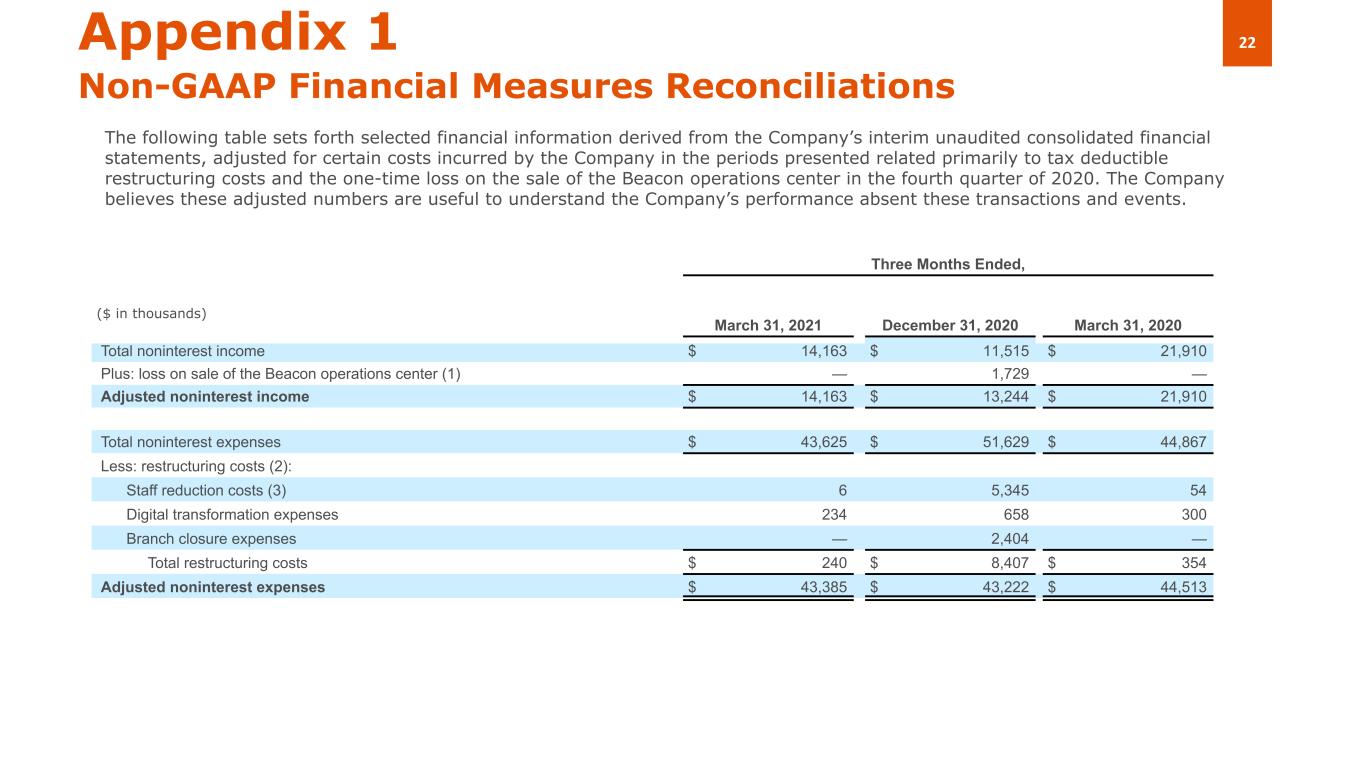 22Appendix 1 Non-GAAP Financial Measures Reconciliations The following table sets forth selected financial information derived from the Company’s interim unaudited consolidated financial statements, adjusted for certain costs incurred by the Company in the periods presented related primarily to tax deductible restructuring costs and the one-time loss on the sale of the Beacon operations center in the fourth quarter of 2020. The Company believes these adjusted numbers are useful to understand the Company’s performance absent these transactions and events. Three Months Ended, ($ in thousands) March 31, 2021 December 31, 2020 March 31, 2020 Total noninterest income $ 14,163 $ 11,515 $ 21,910 Plus: loss on sale of the Beacon operations center (1) — 1,729 — Adjusted noninterest income $ 14,163 $ 13,244 $ 21,910 Total noninterest expenses $ 43,625 $ 51,629 $ 44,867 Less: restructuring costs (2): Staff reduction costs (3) 6 5,345 54 Digital transformation expenses 234 658 300 Branch closure expenses — 2,404 — Total restructuring costs $ 240 $ 8,407 $ 354 Adjusted noninterest expenses $ 43,385 $ 43,222 $ 44,513
