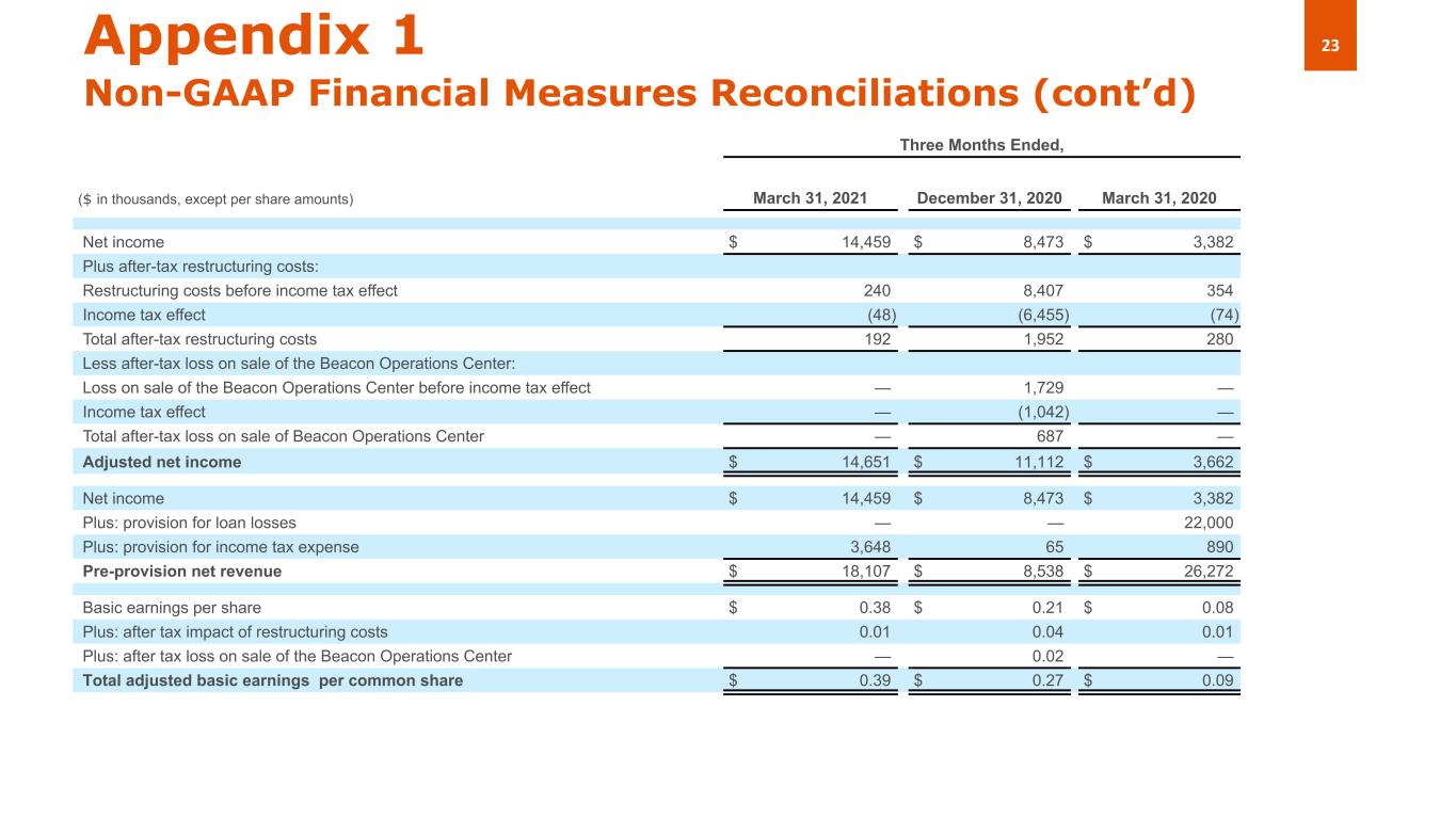 23Appendix 1 Non-GAAP Financial Measures Reconciliations (cont’d) Three Months Ended, ($ in thousands, except per share amounts) March 31, 2021 December 31, 2020 March 31, 2020 Net income $ 14,459 $ 8,473 $ 3,382 Plus after-tax restructuring costs: Restructuring costs before income tax effect 240 8,407 354 Income tax effect (48) (6,455) (74) Total after-tax restructuring costs 192 1,952 280 Less after-tax loss on sale of the Beacon Operations Center: Loss on sale of the Beacon Operations Center before income tax effect — 1,729 — Income tax effect — (1,042) — Total after-tax loss on sale of Beacon Operations Center — 687 — Adjusted net income $ 14,651 $ 11,112 $ 3,662 Net income $ 14,459 $ 8,473 $ 3,382 Plus: provision for loan losses — — 22,000 Plus: provision for income tax expense 3,648 65 890 Pre-provision net revenue $ 18,107 $ 8,538 $ 26,272 Basic earnings per share $ 0.38 $ 0.21 $ 0.08 Plus: after tax impact of restructuring costs 0.01 0.04 0.01 Plus: after tax loss on sale of the Beacon Operations Center — 0.02 — Total adjusted basic earnings per common share $ 0.39 $ 0.27 $ 0.09