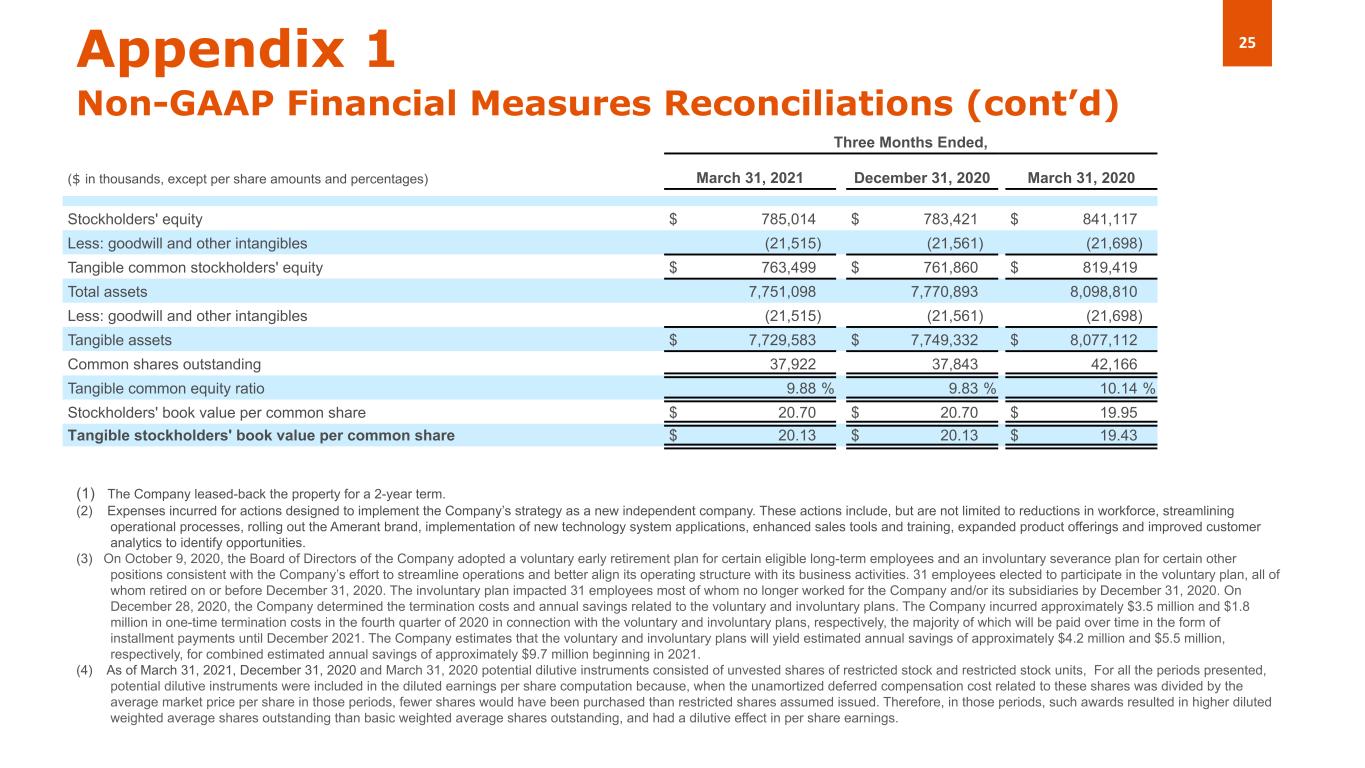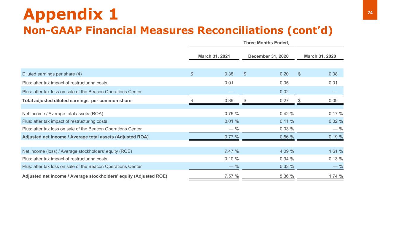 24Appendix 1 Non-GAAP Financial Measures Reconciliations (cont’d) Three Months Ended, March 31, 2021 December 31, 2020 March 31, 2020 Diluted earnings per share (4) $ 0.38 $ 0.20 $ 0.08 Plus: after tax impact of restructuring costs 0.01 0.05 0.01 Plus: after tax loss on sale of the Beacon Operations Center — 0.02 — Total adjusted diluted earnings per common share $ 0.39 $ 0.27 $ 0.09 Net income / Average total assets (ROA) 0.76 % 0.42 % 0.17 % Plus: after tax impact of restructuring costs 0.01 % 0.11 % 0.02 % Plus: after tax loss on sale of the Beacon Operations Center — % 0.03 % — % Adjusted net income / Average total assets (Adjusted ROA) 0.77 % 0.56 % 0.19 % Net income (loss) / Average stockholders' equity (ROE) 7.47 % 4.09 % 1.61 % Plus: after tax impact of restructuring costs 0.10 % 0.94 % 0.13 % Plus: after tax loss on sale of the Beacon Operations Center — % 0.33 % — % Adjusted net income / Average stockholders' equity (Adjusted ROE) 7.57 % 5.36 % 1.74 %