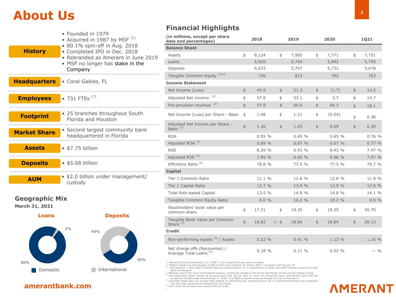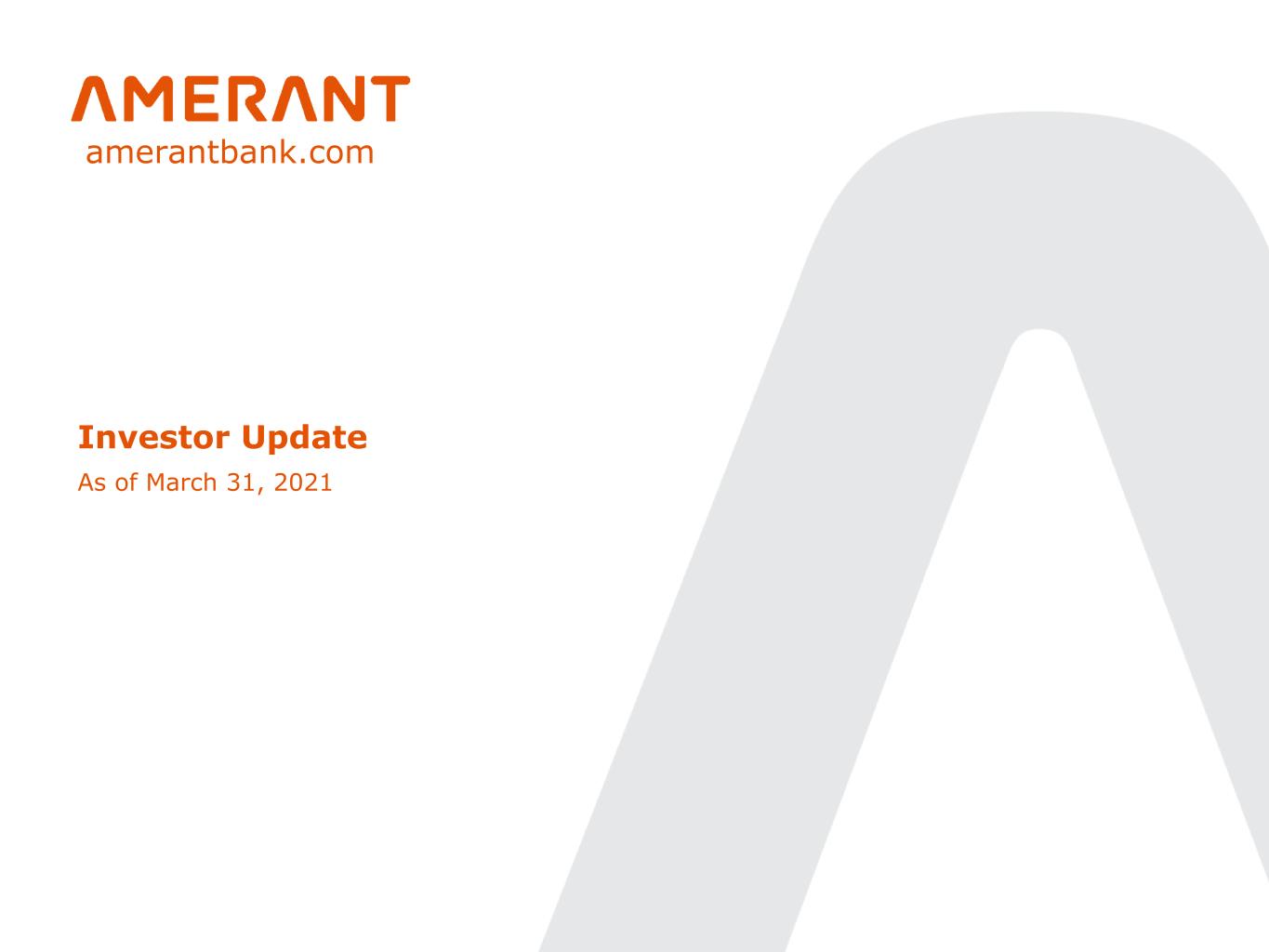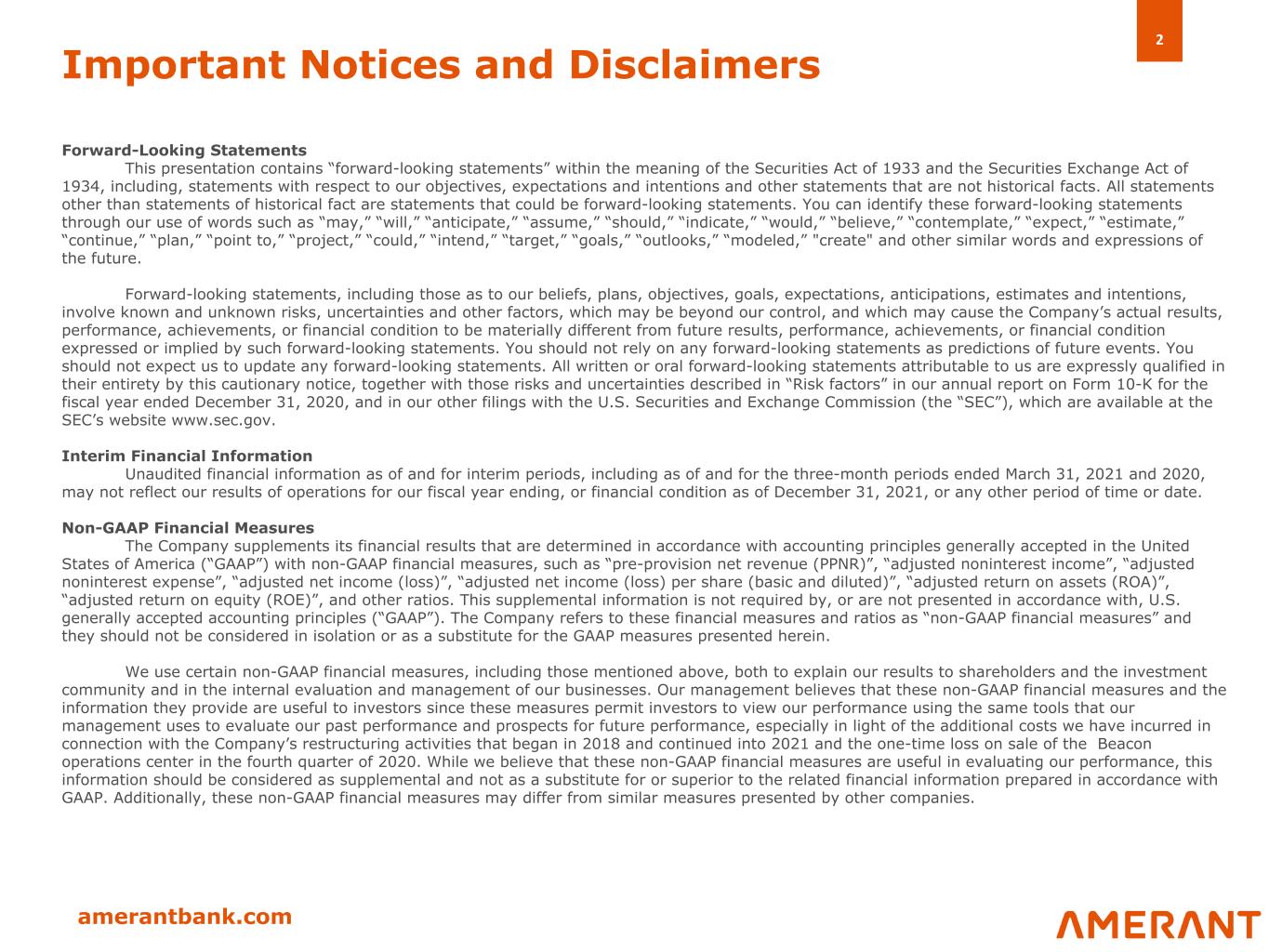 2 amerantbank.com Forward-Looking Statements This presentation contains “forward-looking statements” within the meaning of the Securities Act of 1933 and the Securities Exchange Act of 1934, including, statements with respect to our objectives, expectations and intentions and other statements that are not historical facts. All statements other than statements of historical fact are statements that could be forward-looking statements. You can identify these forward-looking statements through our use of words such as “may,” “will,” “anticipate,” “assume,” “should,” “indicate,” “would,” “believe,” “contemplate,” “expect,” “estimate,” “continue,” “plan,” “point to,” “project,” “could,” “intend,” “target,” “goals,” “outlooks,” “modeled,” "create" and other similar words and expressions of the future. Forward-looking statements, including those as to our beliefs, plans, objectives, goals, expectations, anticipations, estimates and intentions, involve known and unknown risks, uncertainties and other factors, which may be beyond our control, and which may cause the Company’s actual results, performance, achievements, or financial condition to be materially different from future results, performance, achievements, or financial condition expressed or implied by such forward-looking statements. You should not rely on any forward-looking statements as predictions of future events. You should not expect us to update any forward-looking statements. All written or oral forward-looking statements attributable to us are expressly qualified in their entirety by this cautionary notice, together with those risks and uncertainties described in “Risk factors” in our annual report on Form 10-K for the fiscal year ended December 31, 2020, and in our other filings with the U.S. Securities and Exchange Commission (the “SEC”), which are available at the SEC’s website www.sec.gov. Interim Financial Information Unaudited financial information as of and for interim periods, including as of and for the three-month periods ended March 31, 2021 and 2020, may not reflect our results of operations for our fiscal year ending, or financial condition as of December 31, 2021, or any other period of time or date. Non-GAAP Financial Measures The Company supplements its financial results that are determined in accordance with accounting principles generally accepted in the United States of America (“GAAP”) with non-GAAP financial measures, such as “pre-provision net revenue (PPNR)”, “adjusted noninterest income”, “adjusted noninterest expense”, “adjusted net income (loss)”, “adjusted net income (loss) per share (basic and diluted)”, “adjusted return on assets (ROA)”, “adjusted return on equity (ROE)”, and other ratios. This supplemental information is not required by, or are not presented in accordance with, U.S. generally accepted accounting principles (“GAAP”). The Company refers to these financial measures and ratios as “non-GAAP financial measures” and they should not be considered in isolation or as a substitute for the GAAP measures presented herein. We use certain non-GAAP financial measures, including those mentioned above, both to explain our results to shareholders and the investment community and in the internal evaluation and management of our businesses. Our management believes that these non-GAAP financial measures and the information they provide are useful to investors since these measures permit investors to view our performance using the same tools that our management uses to evaluate our past performance and prospects for future performance, especially in light of the additional costs we have incurred in connection with the Company’s restructuring activities that began in 2018 and continued into 2021 and the one-time loss on sale of the Beacon operations center in the fourth quarter of 2020. While we believe that these non-GAAP financial measures are useful in evaluating our performance, this information should be considered as supplemental and not as a substitute for or superior to the related financial information prepared in accordance with GAAP. Additionally, these non-GAAP financial measures may differ from similar measures presented by other companies. Important Notices and Disclaimers
