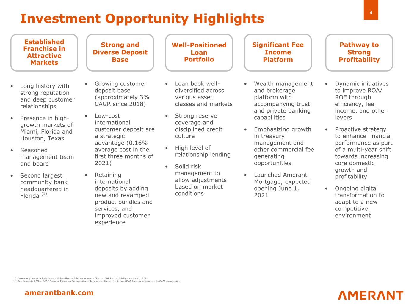 3 amerantbank.com 98% 2% 56% 44% Domestic • Second largest community bank headquartered in Florida About Us • 25 branches throughout South Florida and Houston • $5.68 billion • $7.75 billion • Coral Gables, FL • 731 FTEs (7) • $2.0 billion under management/ custody • Founded in 1979 • Acquired in 1987 by MSF (1) • 80.1% spin-off in Aug. 2018 • Completed IPO in Dec. 2018 • Rebranded as Amerant in June 2019 • MSF no longer has stake in the Company Footprint Assets Headquarters Employees Loans Deposits Geographic Mix Financial Highlights AUM (1) Mercantil Servicios Financieros, C.A. (“MSF”), the Company's former parent company (2) Reflects special one-time dividend of $40.0 million paid on March 13, 2018 to MSF in connection with the spin-off (3) See Appendix 2 ”Non-GAAP Financial Measures Reconciliations" for a reconciliation of these non-GAAP financial measures to their GAAP counterparts. (4) Efficiency ratio is the result of noninterest expense, respectively divided by the sum of noninterest income and net interest income (5) Non-performing assets include all accruing loans past due 90 days or more, all nonaccrual loans, restructured loans that are considered “troubled debt restructurings” or “TDRs”, and OREO properties acquired through or in lieu of foreclosure (6) Calculated based upon the average daily balance of outstanding loan principal balance net of unamortized deferred loan origination fees and costs, excluding the allowance for loan losses (7) Since 2018, the Company has reduced FTEs by 19.8%. l Market Share History Deposits March 31, 2021 (in millions, except per share data and percentages) 2018 2019 2020 1Q21 Balance Sheet Assets $ 8,124 $ 7,985 $ 7,771 $ 7,751 Loans 5,920 5,744 5,842 5,755 Deposits 6,033 5,757 5,732 5,678 Tangible Common Equity (2)(3) 726 813 762 763 Income Statement Net Income (Loss) $ 45.8 $ 51.3 $ (1.7) $ 14.5 Adjusted Net Income (3) $ 57.9 $ 53.1 $ 3.7 $ 14.7 Pre-provision revenue (3) $ 57.9 $ 60.9 $ 84.3 $ 18.1 Net Income (Loss) per Share - Basic $ 1.08 $ 1.21 $ (0.04) $ 0.38 Adjusted Net Income per Share - Basic (3) $ 1.36 $ 1.25 $ 0.09 $ 0.39 ROA 0.55 % 0.65 % 0.65 % 0.76 % Adjusted ROA (3) 0.69 % 0.67 % 0.67 % 0.77 % ROE 6.29 % 6.43 % 6.43 % 7.47 % Adjusted ROE (3) 7.95 % 6.66 % 6.66 % 7.57 % Efficiency Ratio (4) 78.8 % 77.5 % 77.5 % 70.7 % Capital Tier 1 Common Ratio 11.1 % 12.6 % 12.6 % 11.9 % Tier 1 Capital Ratio 12.7 % 13.9 % 13.9 % 12.9 % Total Risk-based Capital 13.5 % 14.8 % 14.8 % 14.1 % Tangible Common Equity Ratio 9.0 % 10.2 % 10.2 % 9.9 % Stockholders' book value per common share $ 17.31 $ 19.35 $ 19.35 $ 20.70 Tangible Book Value per Common Share (3) $ 16.82 (2) $ 18.84 $ 18.84 $ 20.13 Credit Non-performing Assets (5) / Assets 0.22 % 0.41 % 1.13 % 1.16 % Net charge offs (Recoveries) / Average Total Loans (6) 0.18 % 0.11 % 0.52 % — % International