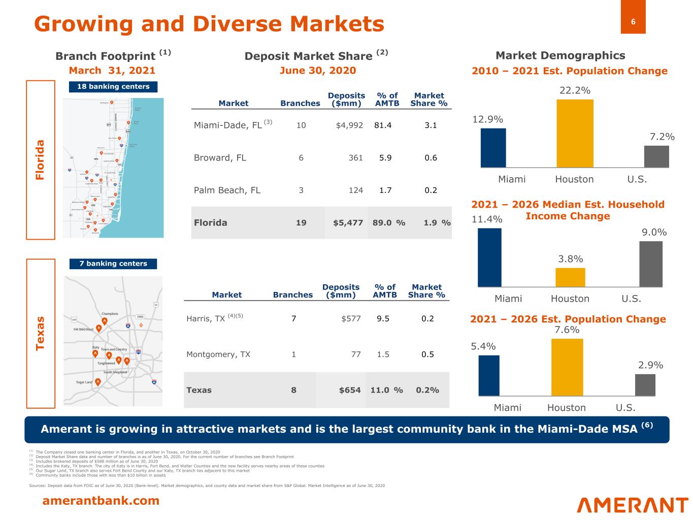 5 amerantbank.com Jerry Plush Vice-Chairman & Chief Executive Officer 62 years old Carlos Iafigliola Executive Vice President & Chief Financial Officer 44 years old Alfonso Figueredo President & Chief Operating Officer 60 years old Alberto Capriles Executive Vice President & Chief Risk Officer 53 years old Miguel Palacios Executive Vice President & Chief Business Officer 52 years old Experienced Management Team • Executive Vice President and Chief Business Officer since February 2018 • All 28 years of banking experience spent with MSF / AMTB • Domestic Personal and Commercial Manager from 2012 to 2018 • Special Assets Manager from 2009 to 2012 • Executive Vice President and Chief Risk Officer since 2015 • 25 years with MSF / AMTB • Corporate Treasurer of MSF from 2008 to 2015 • Corporate Market Risk Manager of MSF from 1999 to 2008 • President and COO since February 2018 • 32 years with MSF / AMTB • Executive Vice President of Operations and Administration of MSF from 2015 to 2018 • CFO of MSF from 2008 to 2015 • CFO since May 2020 • 22 years with MSF / AMTB • Head of Treasury from 2015 to April 2020 • Asset & Liability Manager at AMTB from 2004 to 2015 • Served in Market Risk Management at MSF 1998 to 2004 • Vice-Chairman & Chief Executive Officer since March 2021 • Served as Executive Vice-Chairman from Feb 2021 until Mar 2021 and has served on the Board of Directors since July 2019 • Former partner at Patriot Financial Partners • Prior experience includes: – Sr. executive roles at Verdigris Holdings, Santander USA, Webster Bank and MBNA America – Board director at Santander Consumer, FHLB of Pittsburgh and Webster Bank